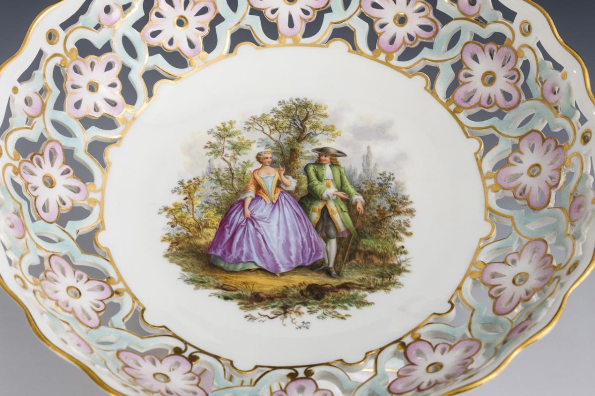 Schale mit Blütendurchbruch und geschweift godroniertem Fuß. Im Spiegel die Darstellung eines eleganten Rokokopaares in einer Landschaft.