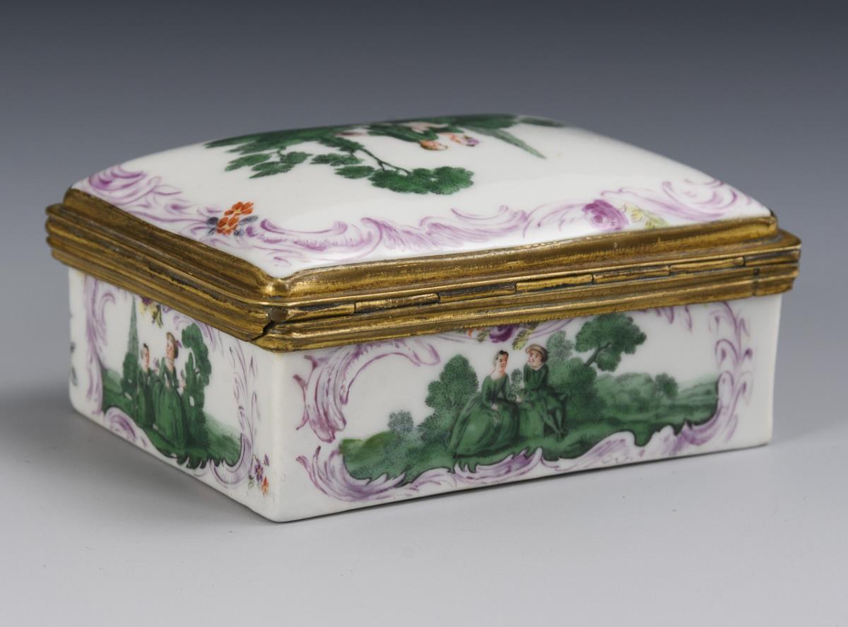 Rechteckige Dose mit metallmontiertem Scharnierdeckel. Allseitig sowie auf dem Deckel kupfergrüne Watteau-Malerei, im Deckel ein von fein goldgravierten Blumen gerahmtes Medaillon mit der Darstellung einer am Tisch sitzenden Dame mit einer Näharbeit. Korpus restauriert.