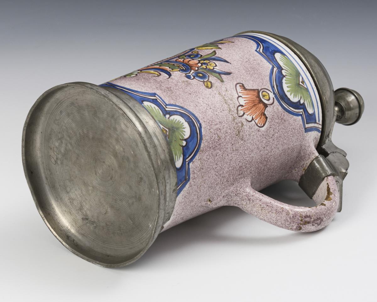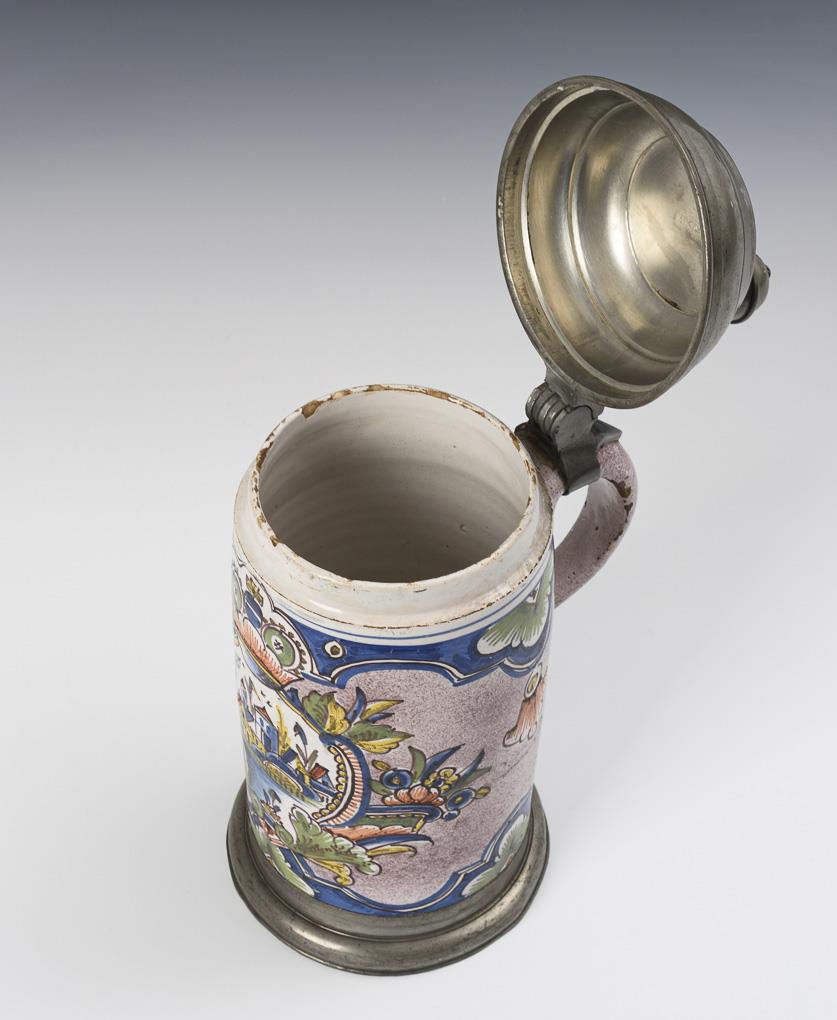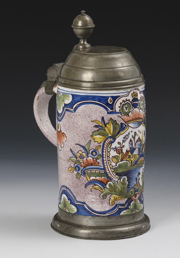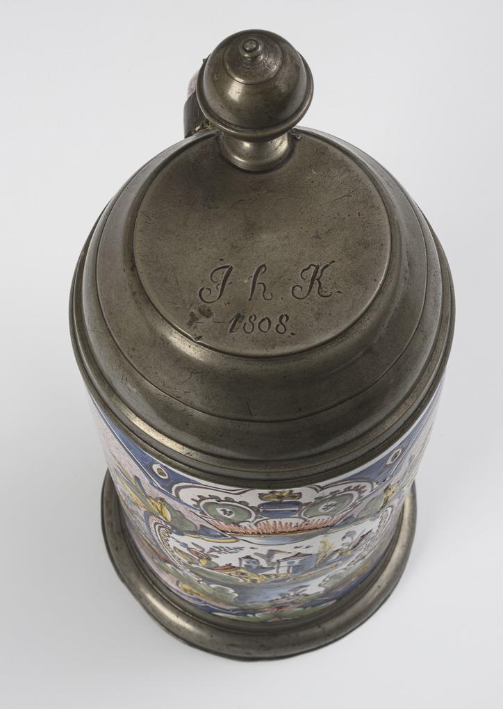 Zylindrischer Korpus mit Bandhenkel, umlaufend manganjaspierte Wandung, schauseitig eine bekrönte Reserve mit Rocaillen und Architekturansicht. Zinndeckel mit Kugeldrücker, graviert "JhK 1808", Zinnstand. Wandungsrissig, leichte Alters- und Gebrauchsspuren, leichte Glasurbestoßungen.