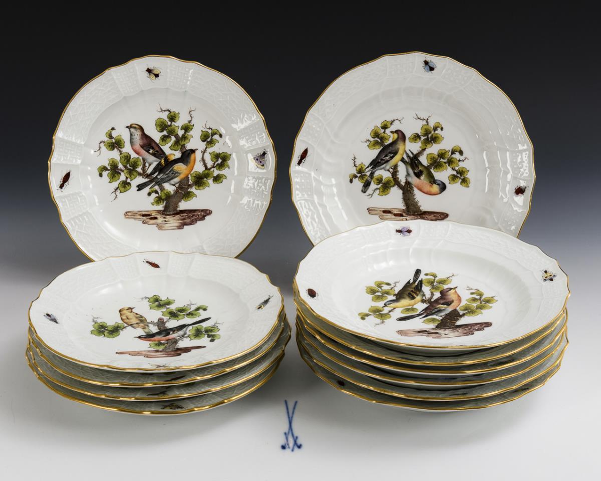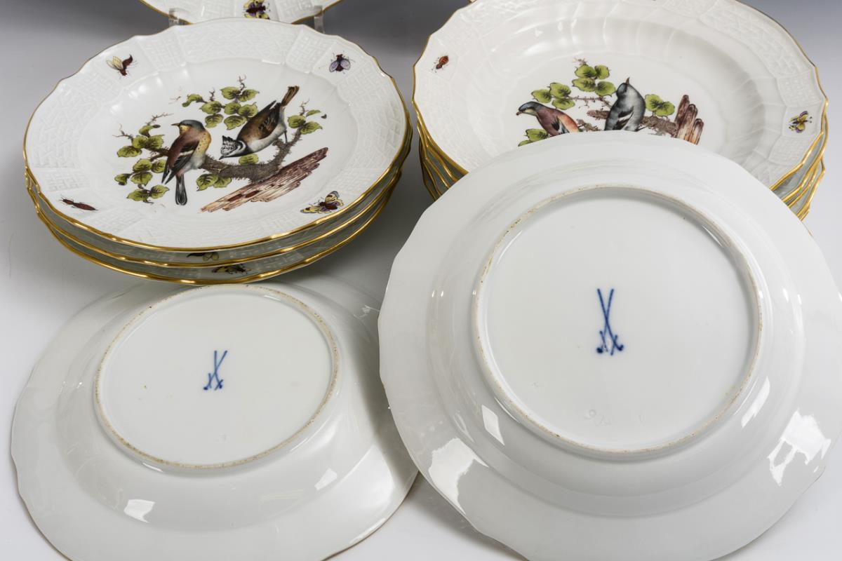5 + 7 Speiseteller mit Vogelmalerei. Meissen.