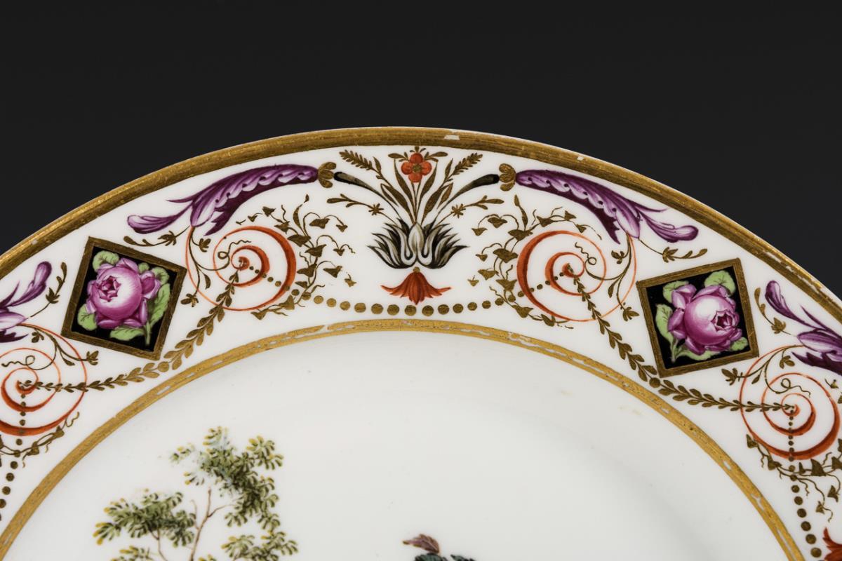 Flacher Teller mit feiner ornamentaler Malerei mit Girlanden und Rosen auf der Fahne, im Spiegel die Darstellung einer Landschaftsinsel mit Goldfasan. Minimaler Goldabrieb.