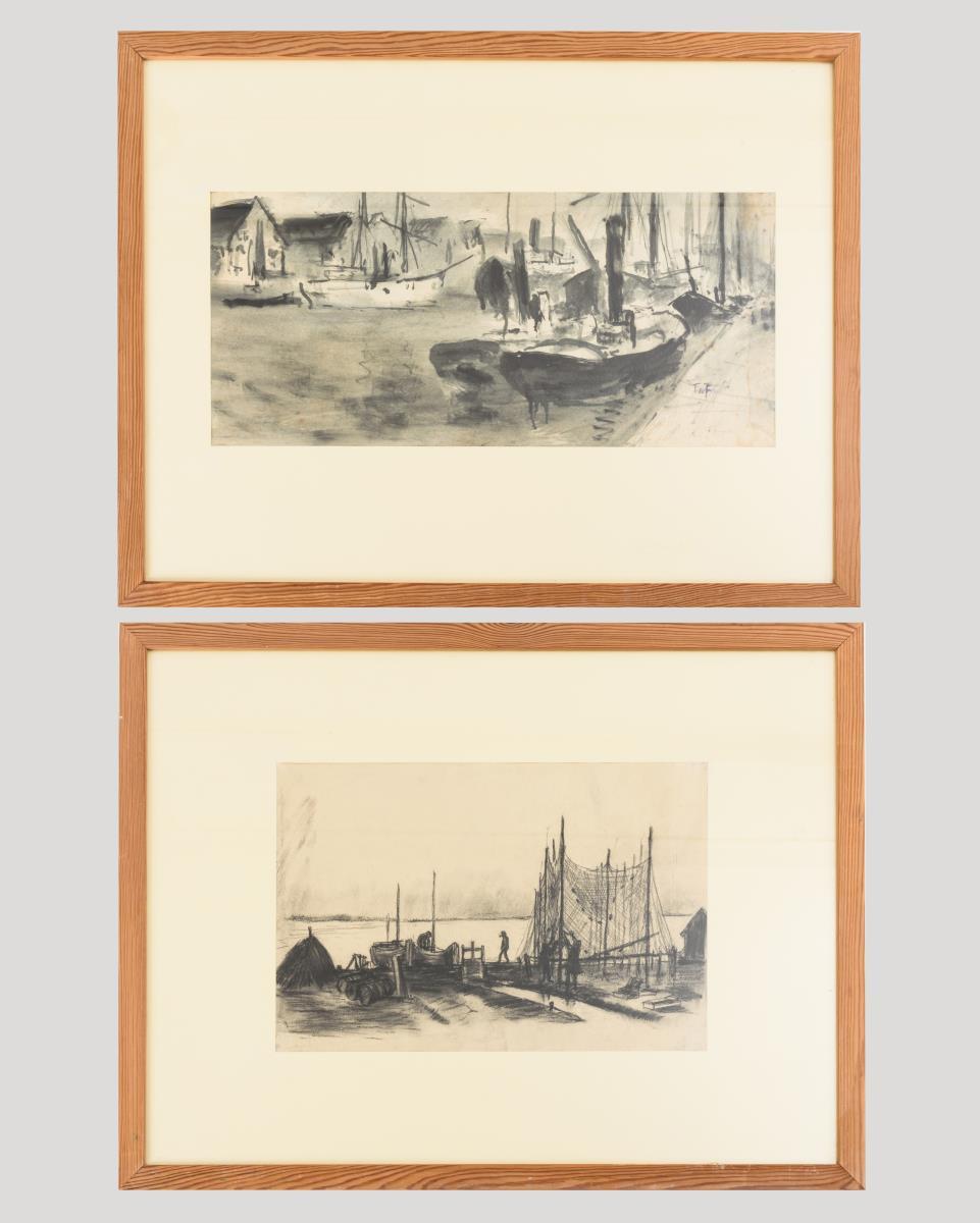 Kohlezeichnung: Hafenszene mit Fischernetzen, Passepartoutausschnitt 27,5 x 40 cm | Aquarell: Fischerboote im Hafen, Passepartoutausschnitt 24 x 52 cm. Stockfleckig.