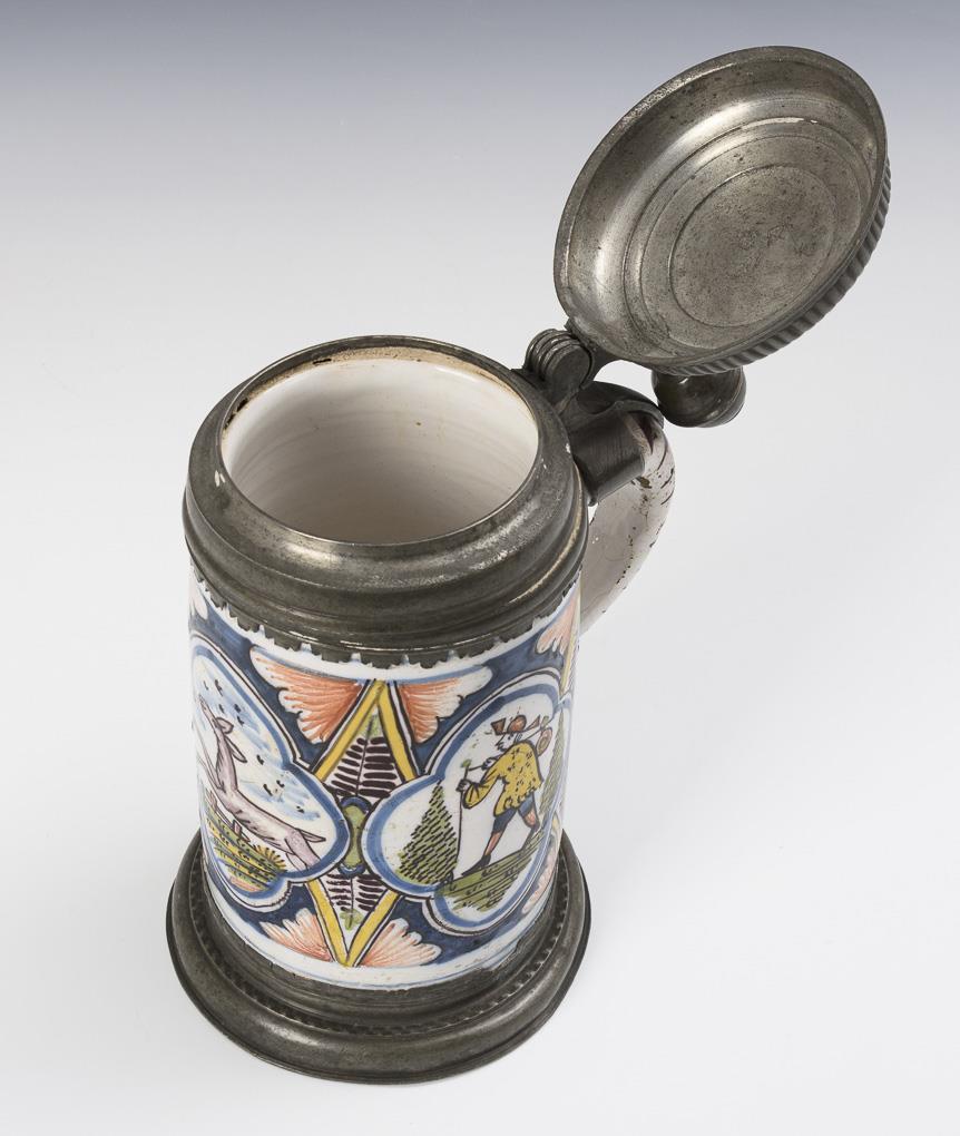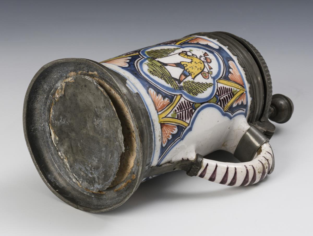 Zierlicher, zylindrischer Korpus mit strichverziertem Bandhenkel, umlaufend 3 Vierpassreserven mit einem springenden Pferd und zwei Wanderern in Landschaft. Profilierter Zinndeckel mit Kugeldrücker, graviert "ASS 1752", Zinnstand. Leichte Alters- und Gebrauchsspuren, Defekte und Reparaturen am Zinn.