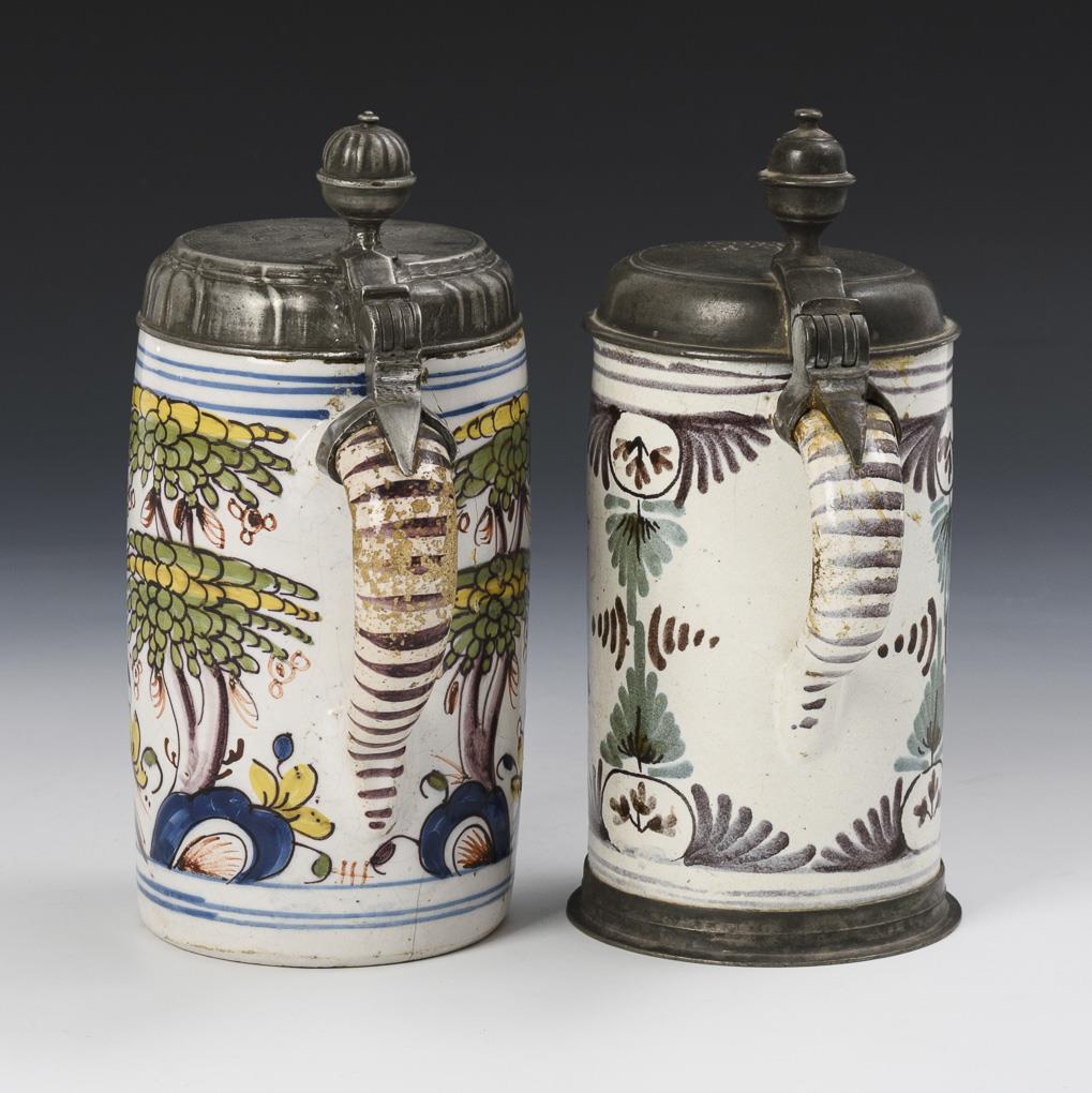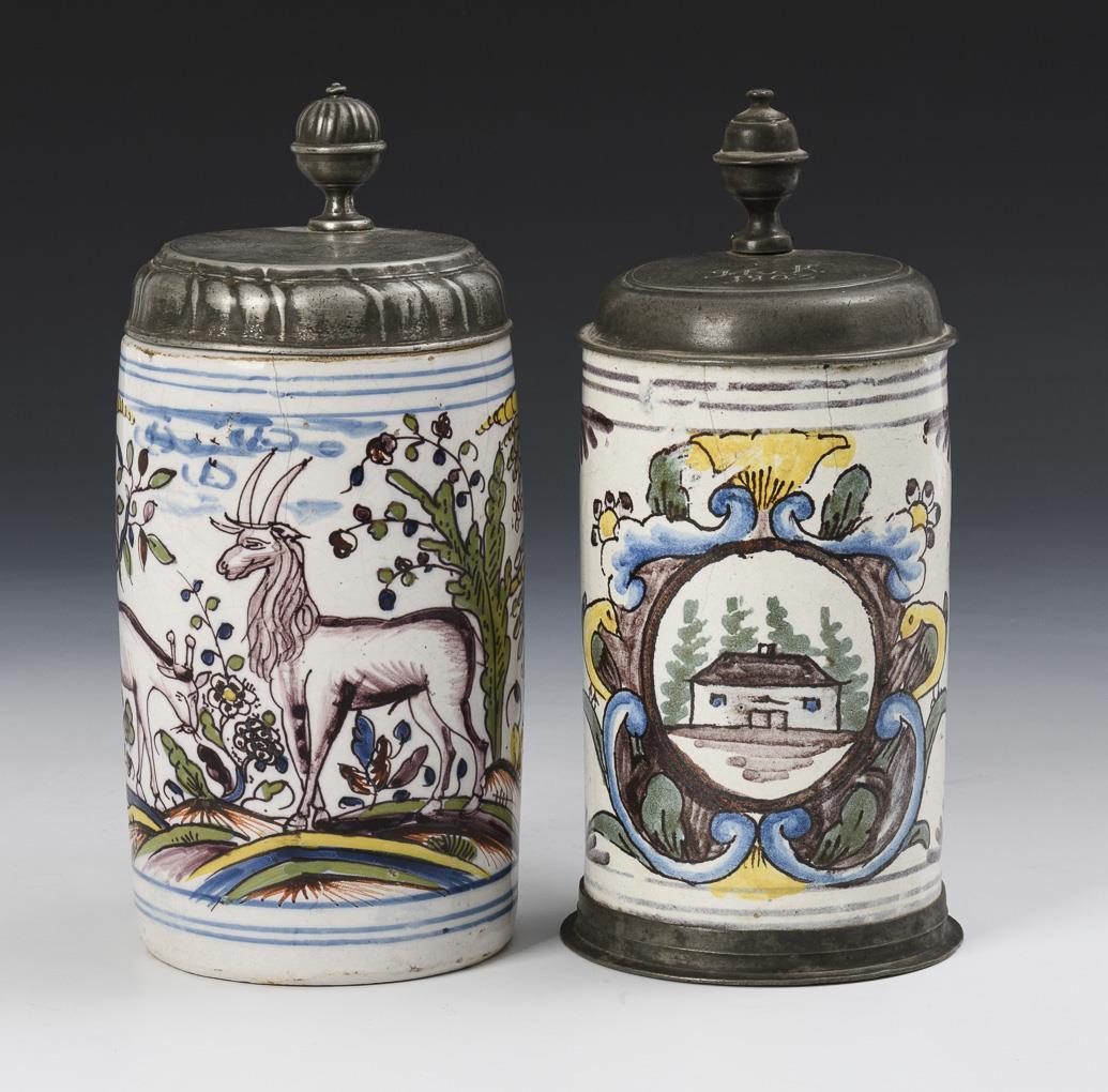 2 barocke Fayence-Walzenkrüge mit Tieren und Architektur.