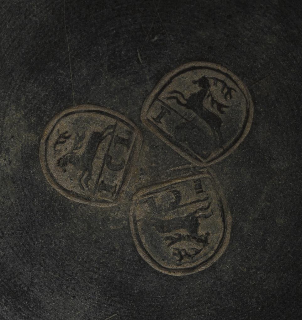 Jeweils zylindrischer Korpus mit Bandhenkel, 1x Darstellung mit Waldtieren in Landschaft, 1x Hausansicht in einer Barockreserve. Je mit Zinndeckel, 1x Zinnstand. Mit Defekten.