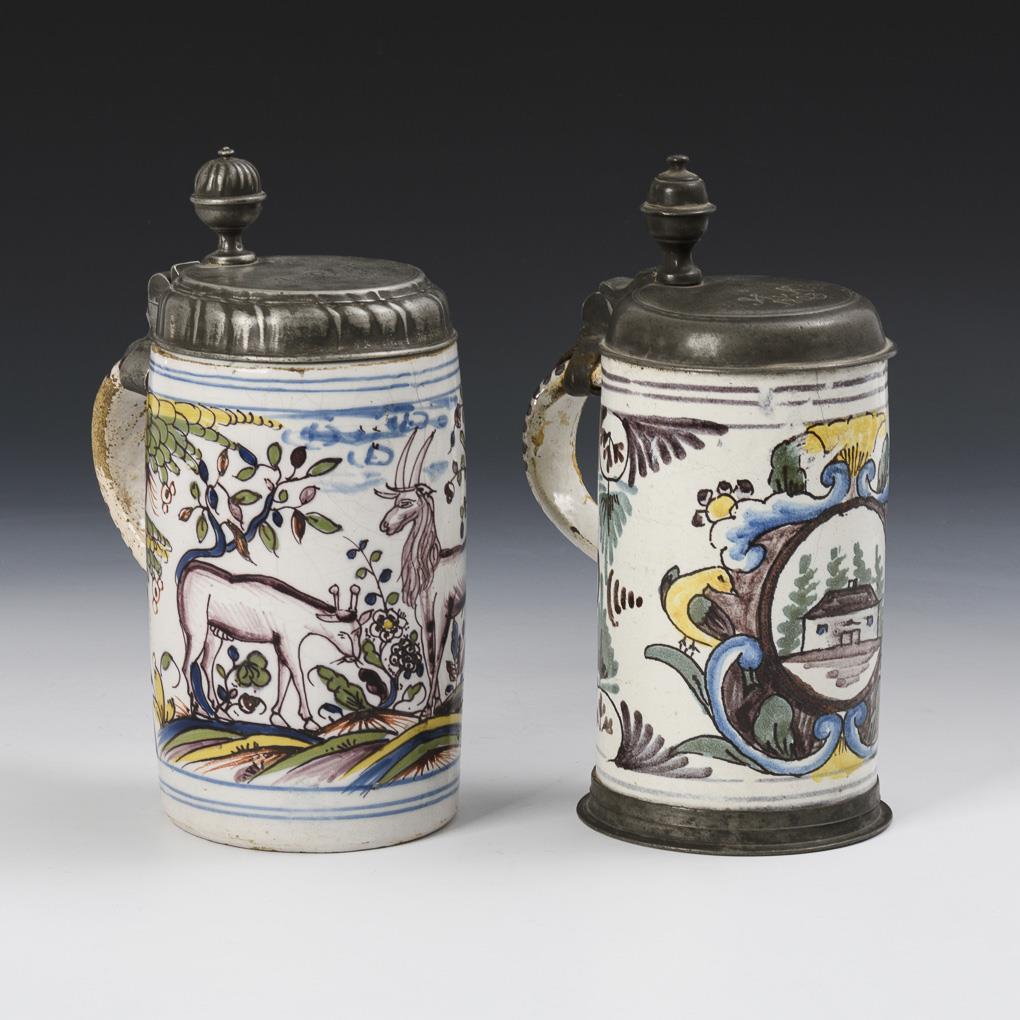 2 barocke Fayence-Walzenkrüge mit Tieren und Architektur.