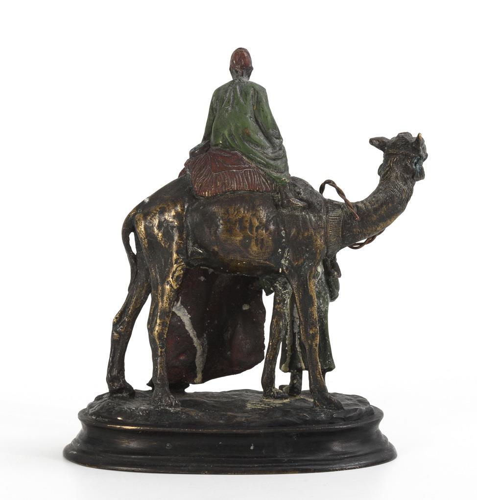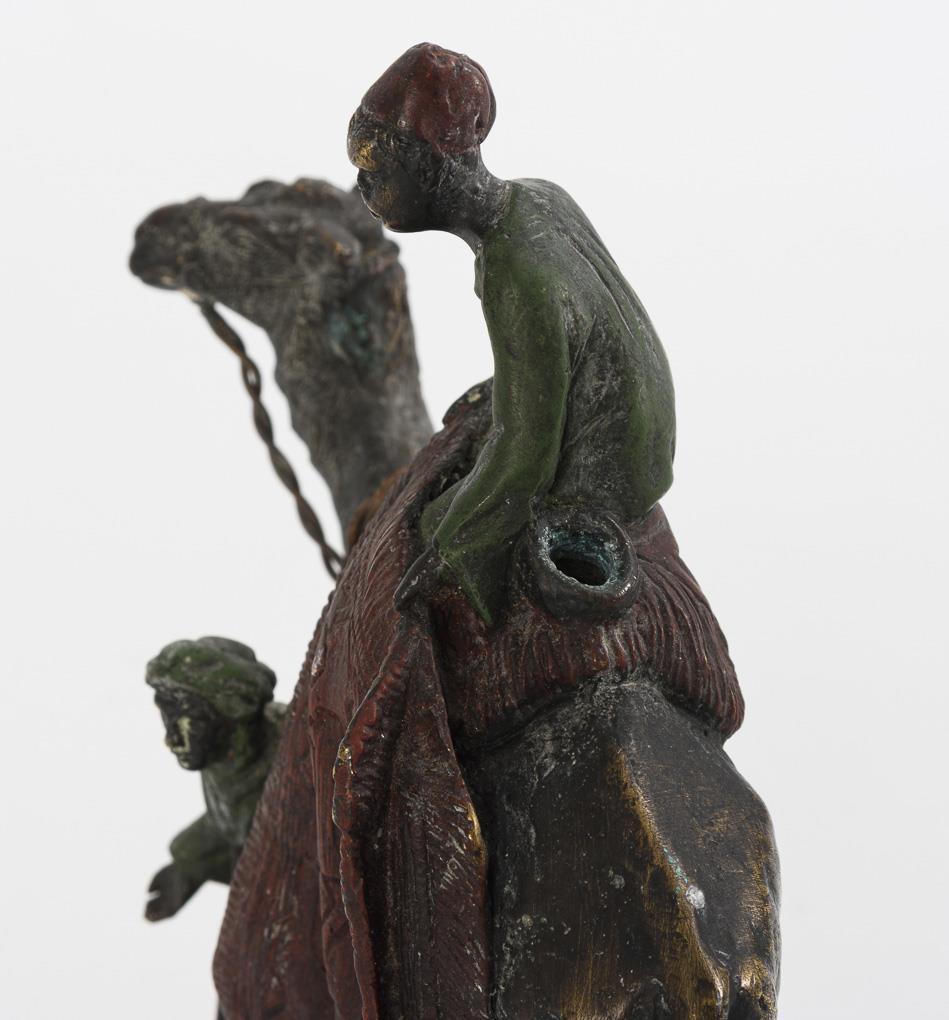 Im Stil der Wiener Bronzen gestaltete Teppichhändler mit Dromedar. Farbe berieben, originales Bohrloch für fehlenden Aufsatz.