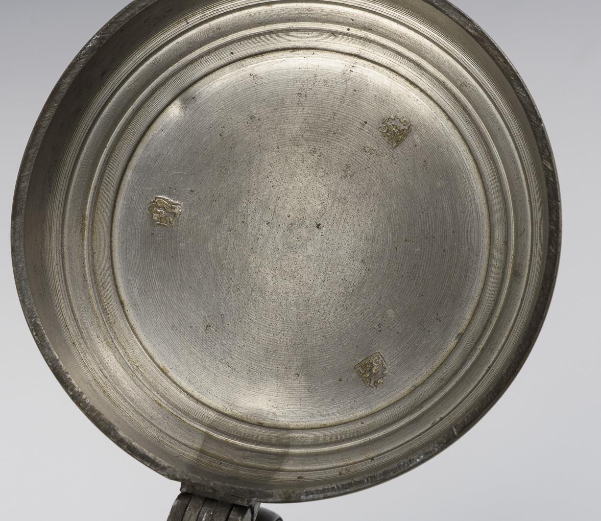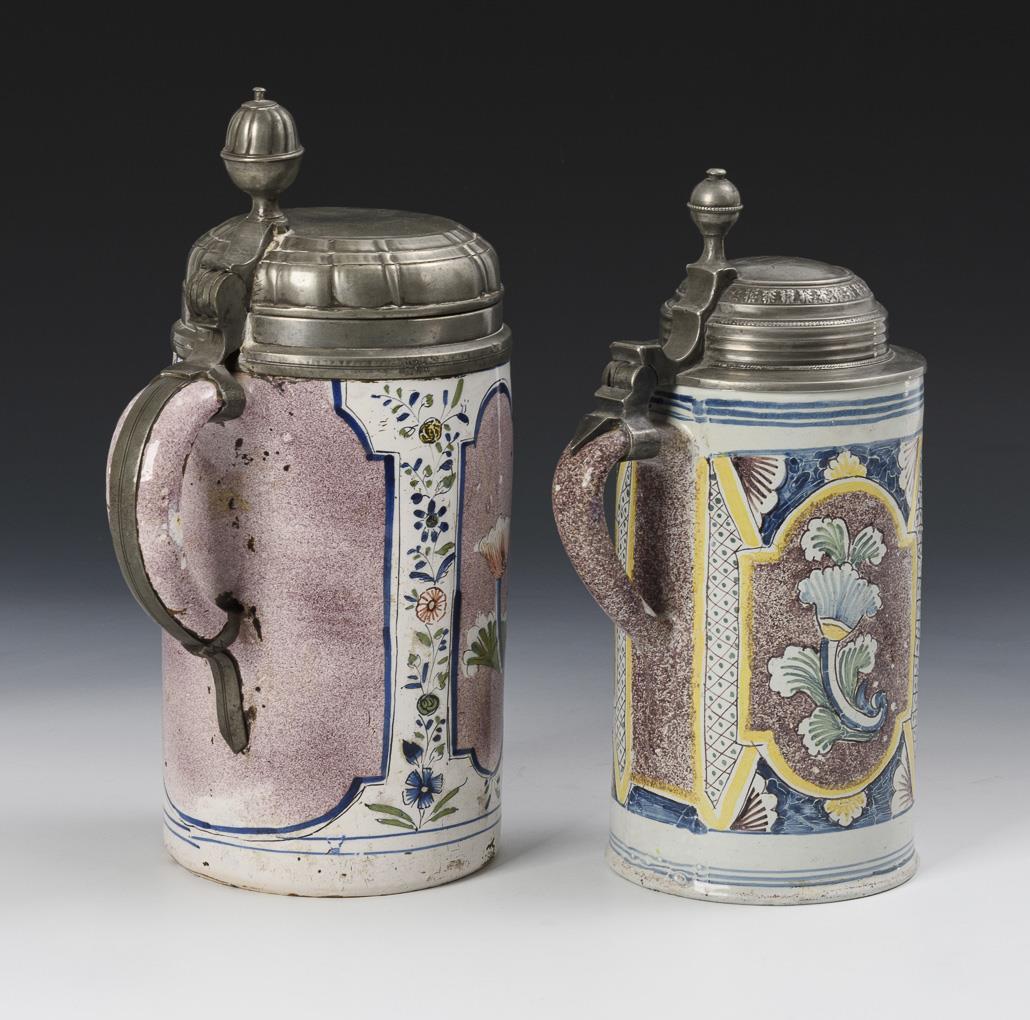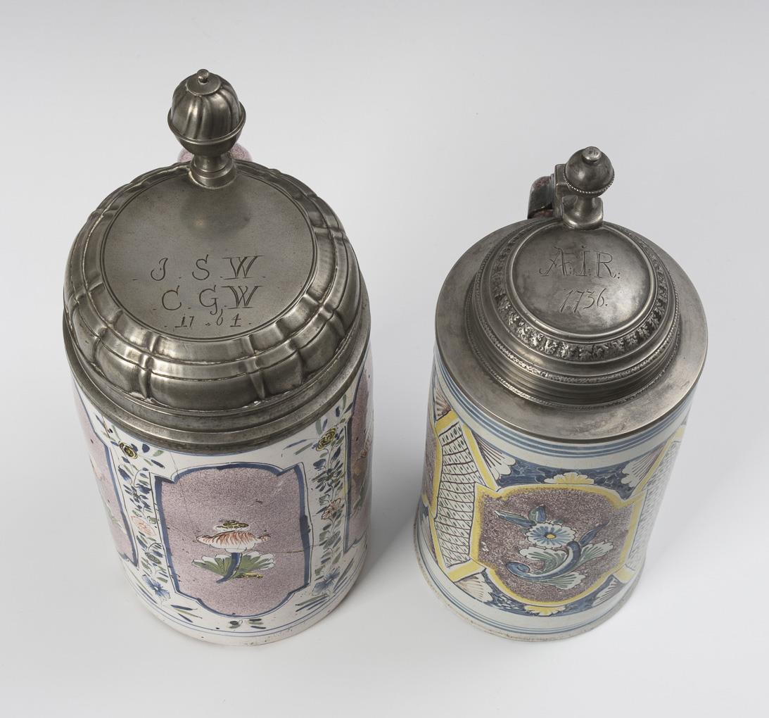 Jeweils zylindrischer Korpus mit Bandhenkel, umlaufend blumengefüllte Barockreserven. Je mit profiliertem und graviertem Zinndeckel. Mit Defekten und Restaurierung.