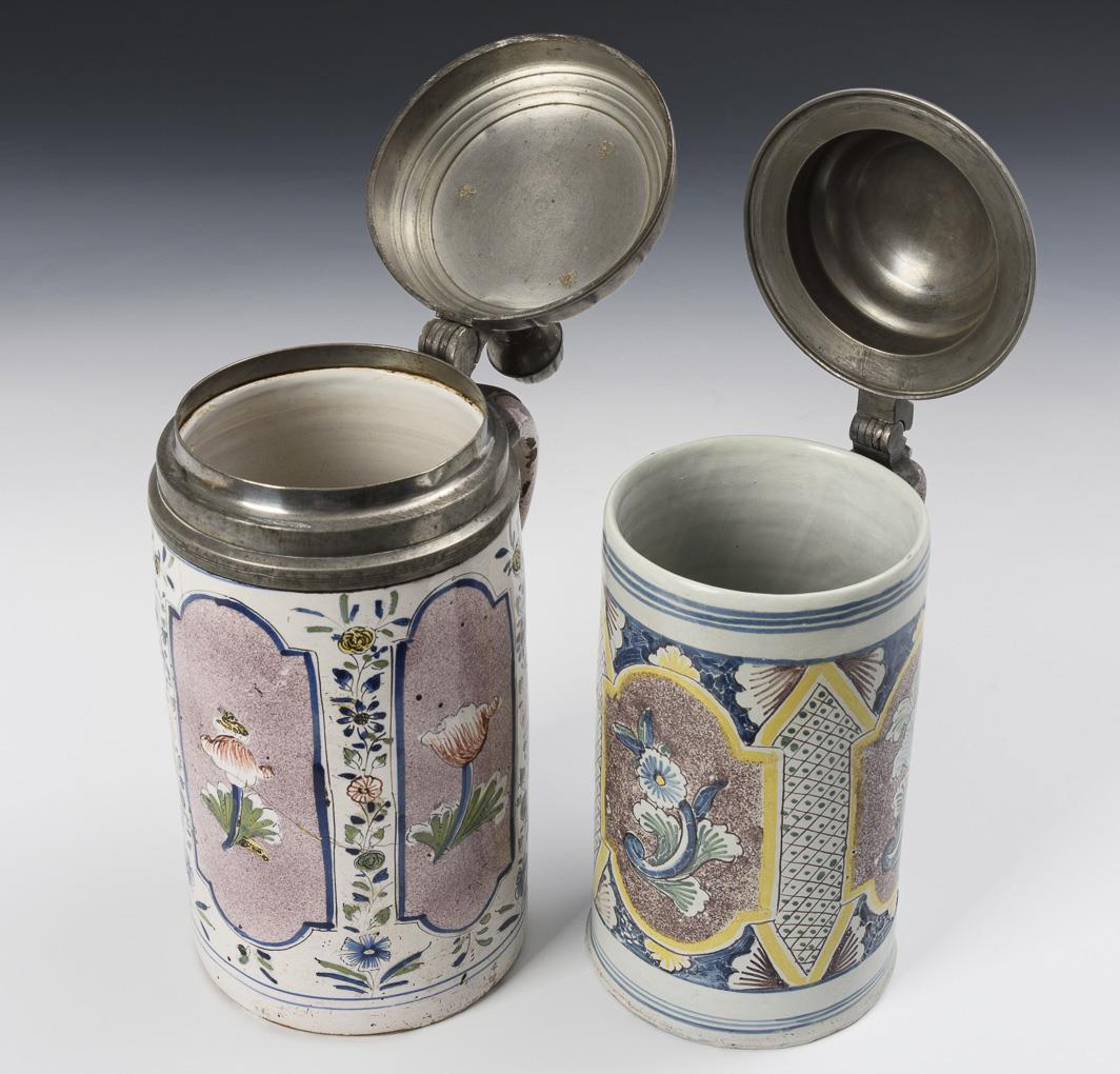 2 barocke Thüringer Fayence-Walzenkrüge mit Pilasterdekor und Blumenreserven.