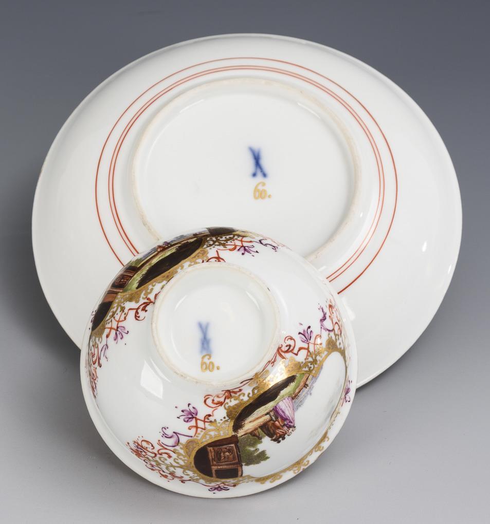 Polychrom bemalt, goldstaffiert. Koppchen (H 4,5 cm), originale Untertasse (Ø 13 cm).