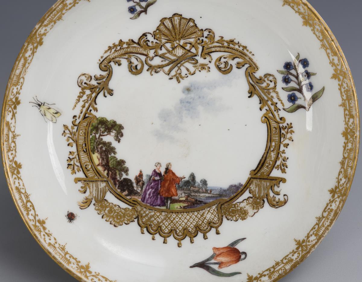 Bauchige Tasse mit Ohrenhenkel. Schauseitig sowie im Spiegel der Untertasse eine goldrocaillegerahmte Kartusche mit der Darstellung eines galanten Paares in einer Landschaft. Henkel restauriert, minimale Bestoßung am Untertassenrand.