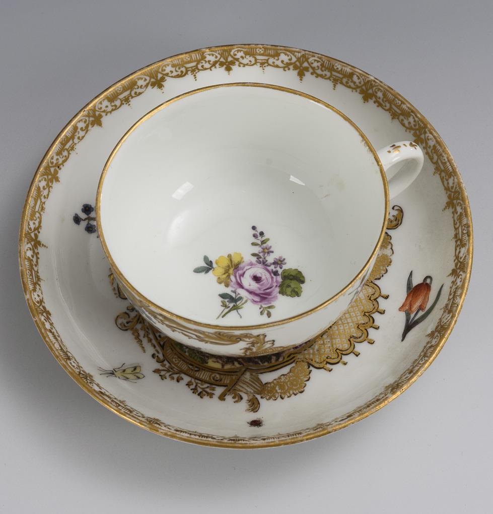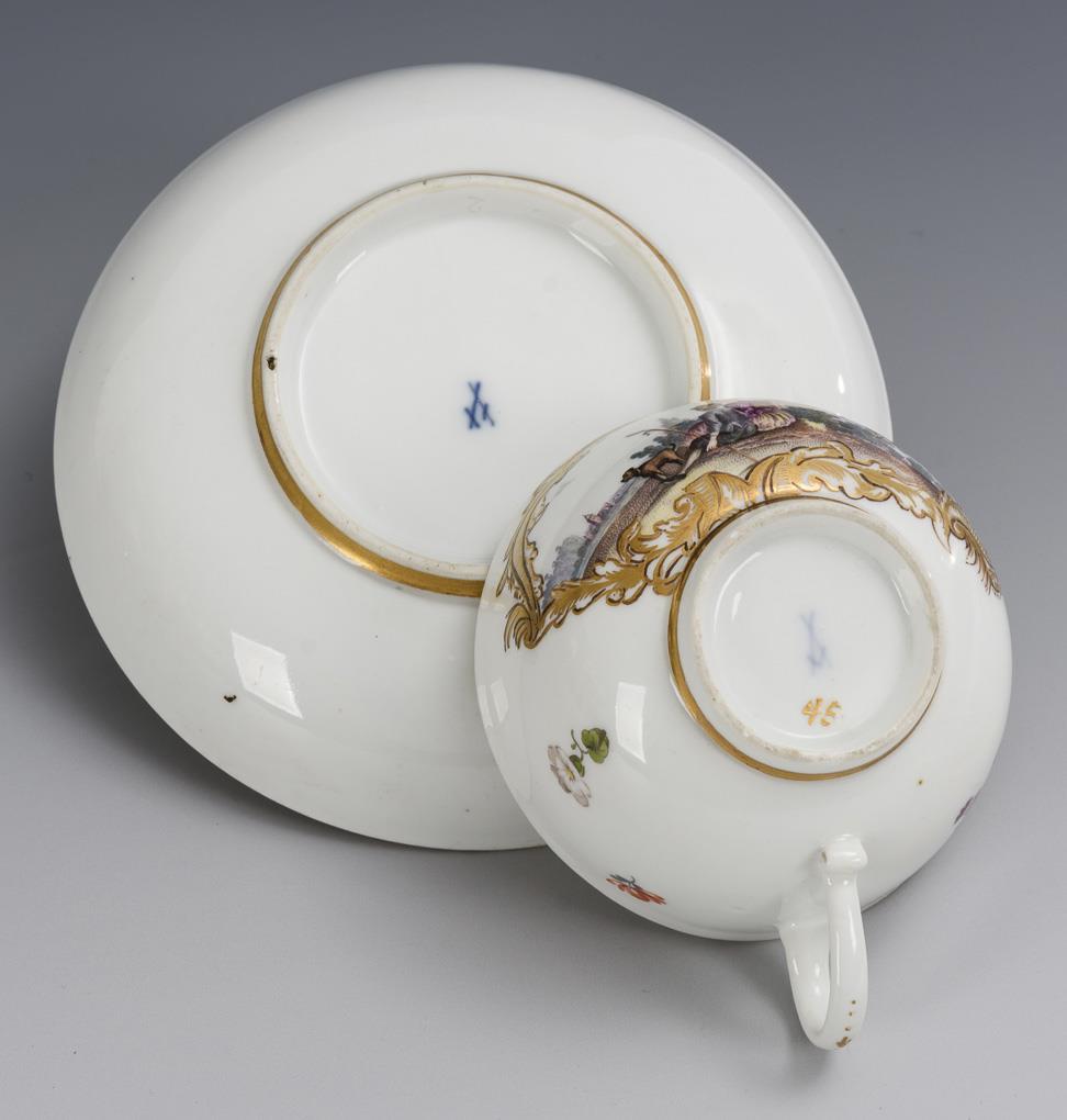 Polychrom bemalt, goldstaffiert. Tasse (H 4,5 cm), originale Untertasse (Ø 13 cm).