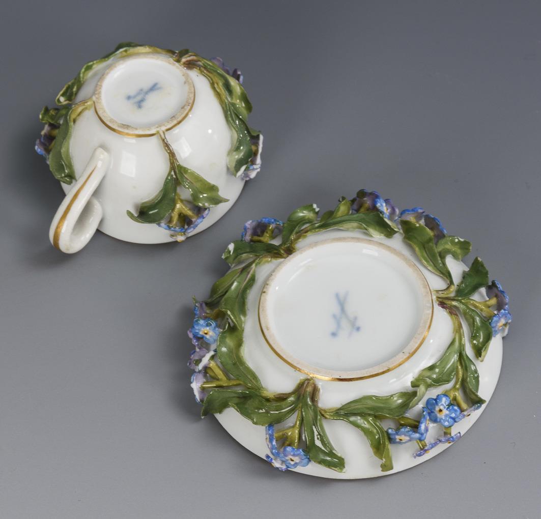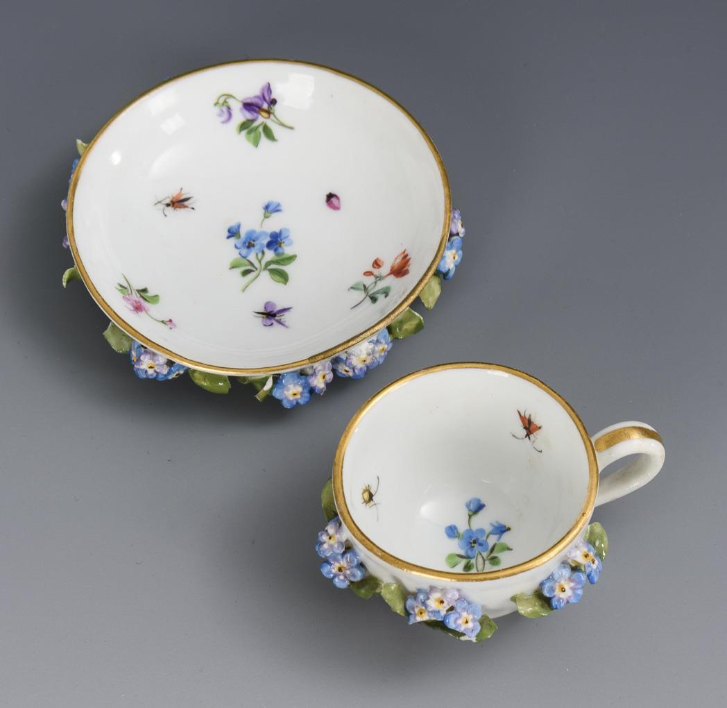 Kleine bauchige Tasse mit aufgelegten Vergißmeinnichtblüten sowie Streublümchen- und Insektenmalerei. Bestoßungen am Belag, Restaurierung am Untertassenrand.