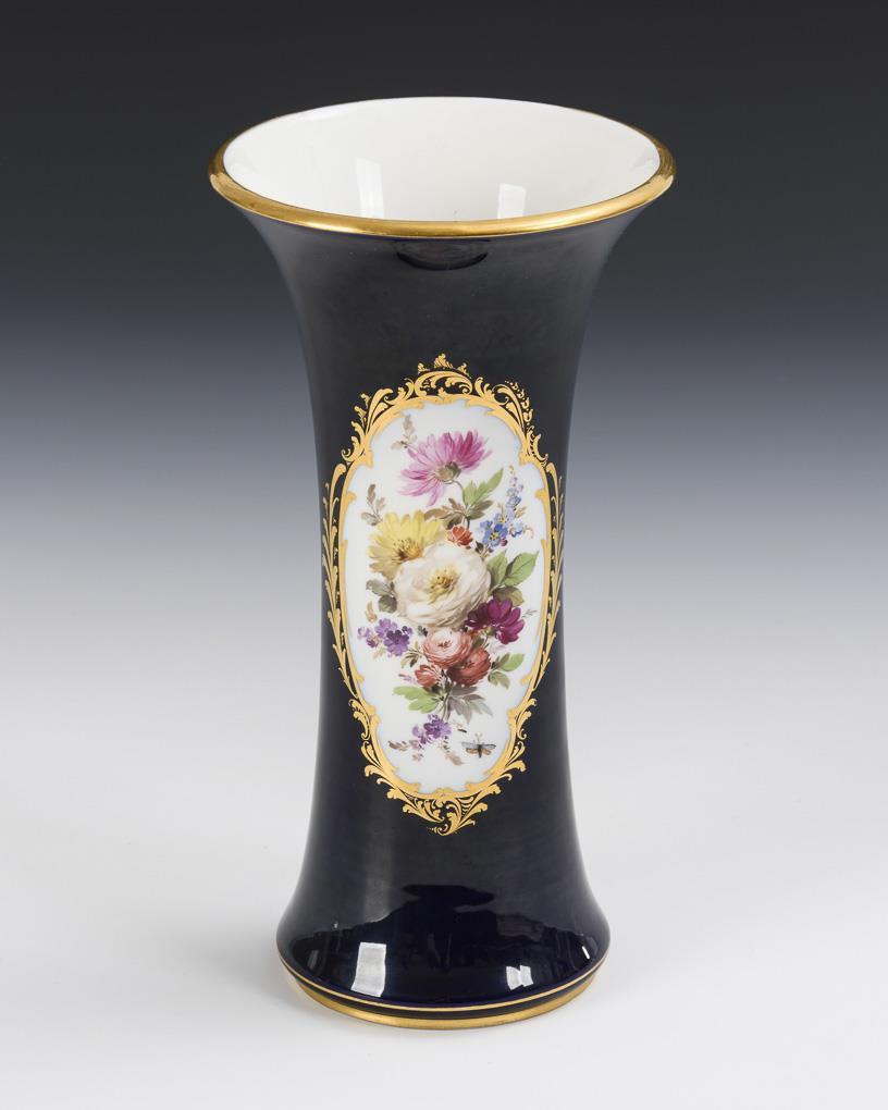 Flötenvase mit Kobaltfond und Blumenmalerei. Meissen.
