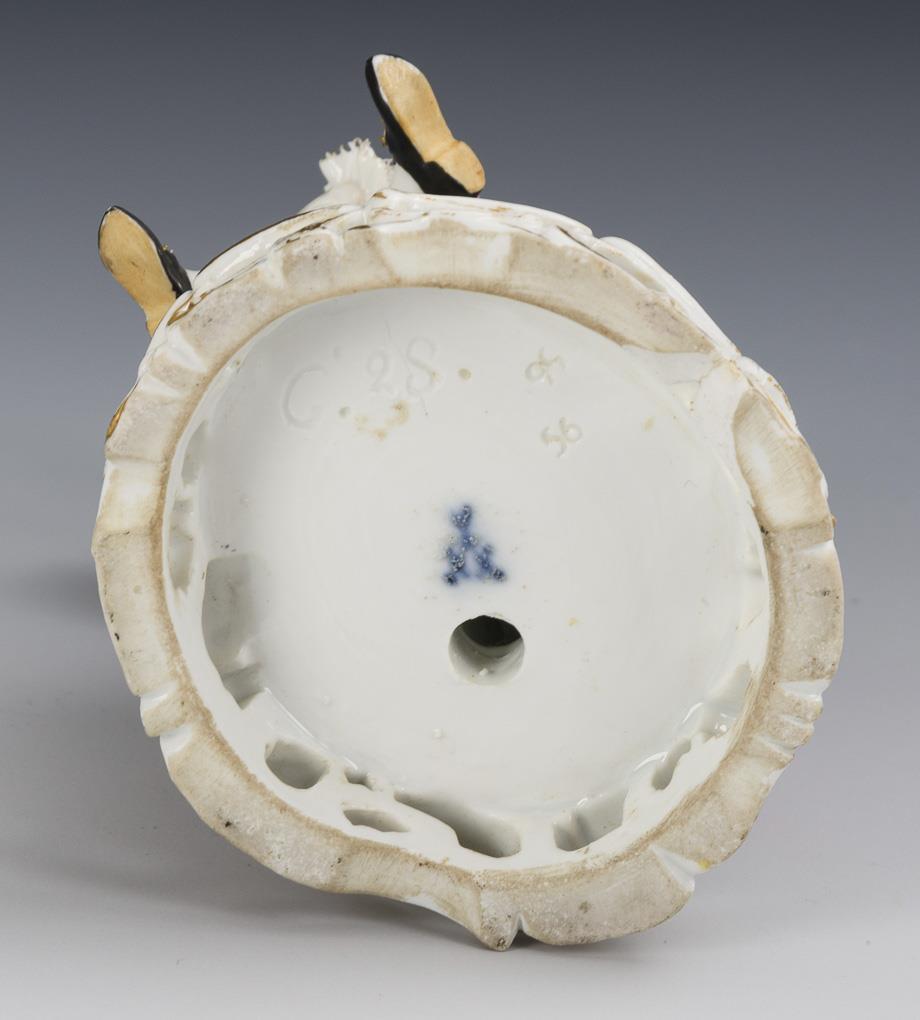 Auf einem Stuhl sitzender, ein Buch lesender Knabe. Unterseitige Bestoßung am Sockel, einige Blätter bestoßen, kleiner Brandriss in der Lehne, rechte Hand, Buch, Degengriff und Dreispitz restauriert.