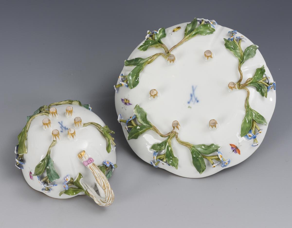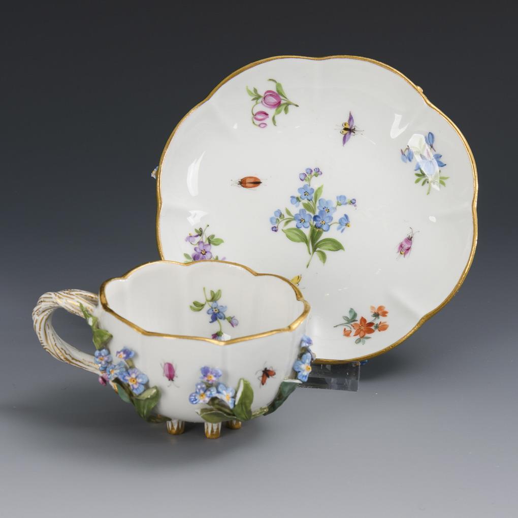 Achtpassige Tasse mit gewundenem Asthenkel und sechs Füßchen. Belegt mit Vergißmeinnichtzweigen, mit Streublümchen- und Insektenmalerei. Bestoßungen am Belag.