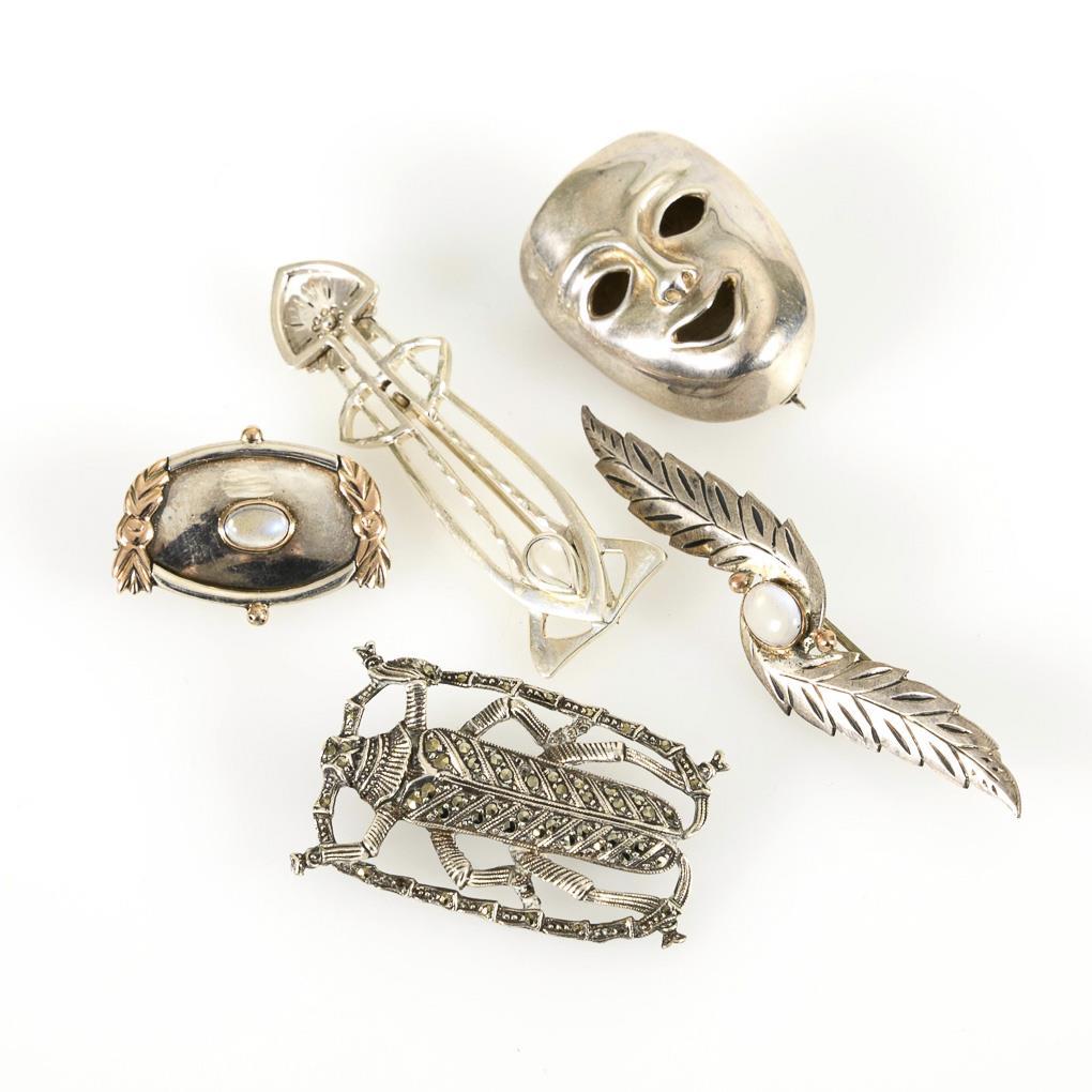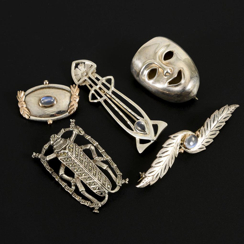 5 verschiedene Broschen (u.a. Maske, Insekt, Ornamente), partiell mit Mondsteincabochons und Markasitbesatz. Kugelhaken.
