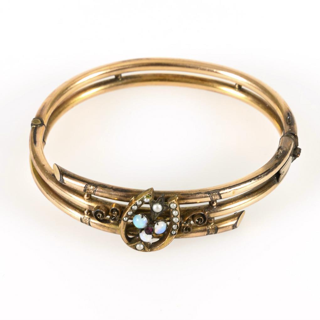 Ovaler Klappreif mit 3 kleinen Opalcabochons in Hufeisenzier. Kastenschloss. Sicherheitskettchen fehlt.