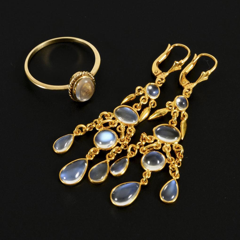 Ring mit zargengefasstem Cabochon zwischen schmaler Schiene. Ohrhängerpaar mit abgehängten, zargengefassten Cabochons an Federbügel.