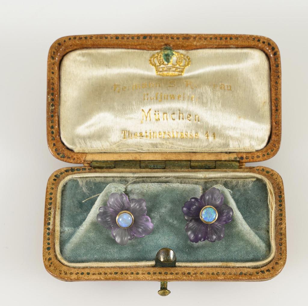 Ohrsteckerpaar mit Amethyst und Opal, in altem Etui.