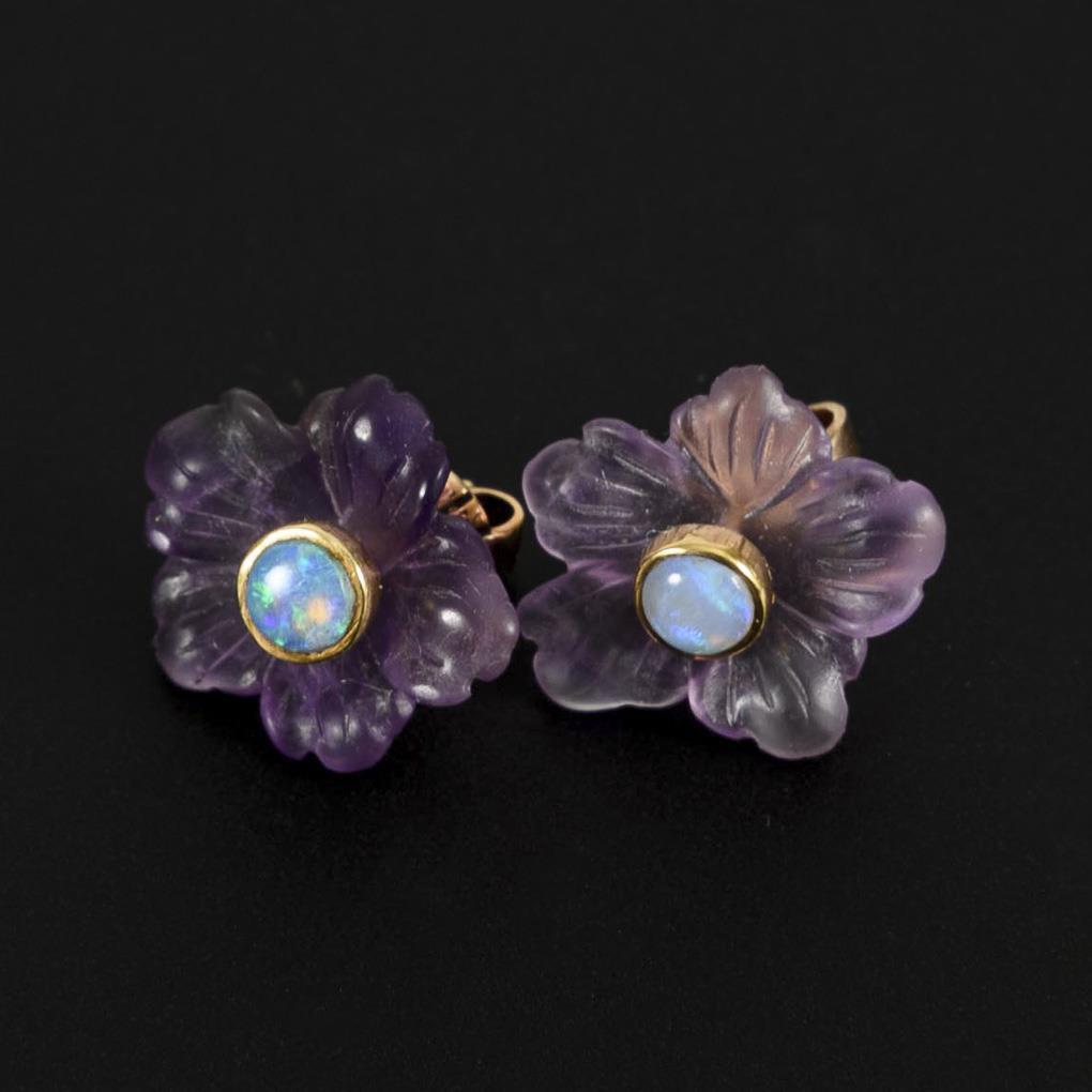Geschnittene Amethystblüte mit zargengefasstem Opal, an Steckmechanik. Opalstecker einzeln tragbar.