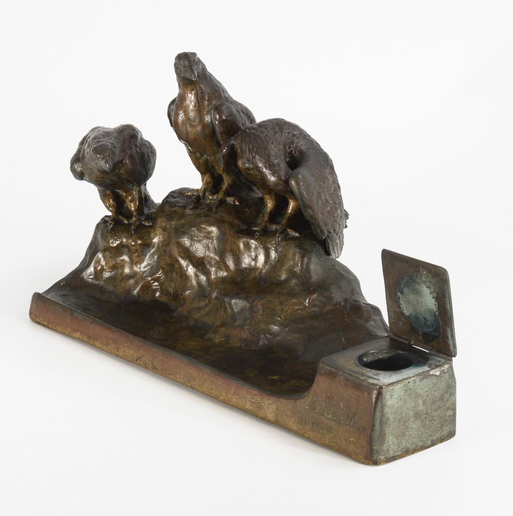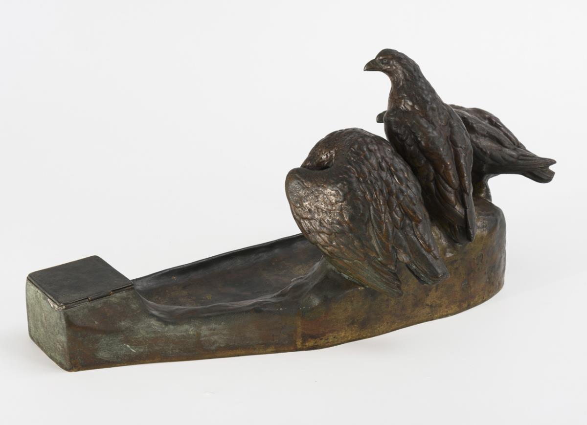 3 Greifvögel auf dem Fels über der muldenförmigen Stiftschale sowie Scharnierdeckel auf dem Tintenfassgehäuse. Tintenfasseinsatz fehlt.
