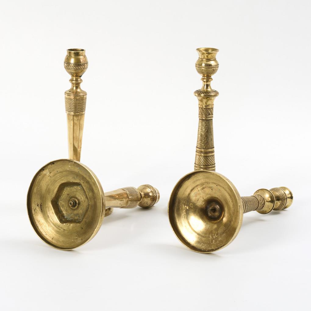 Je mit feinen Reliefornamenten verzierte Bronzeleuchter; 1 Paar mit mehrteiligem Säulenschaft, 1 Paar mit facettiertem konischen Schaft. 1 ergänzter durchgehender Gewindestab in einem Leuchter mit Säulenschaft, 1 Kerbe am anderen Leuchterpaar.