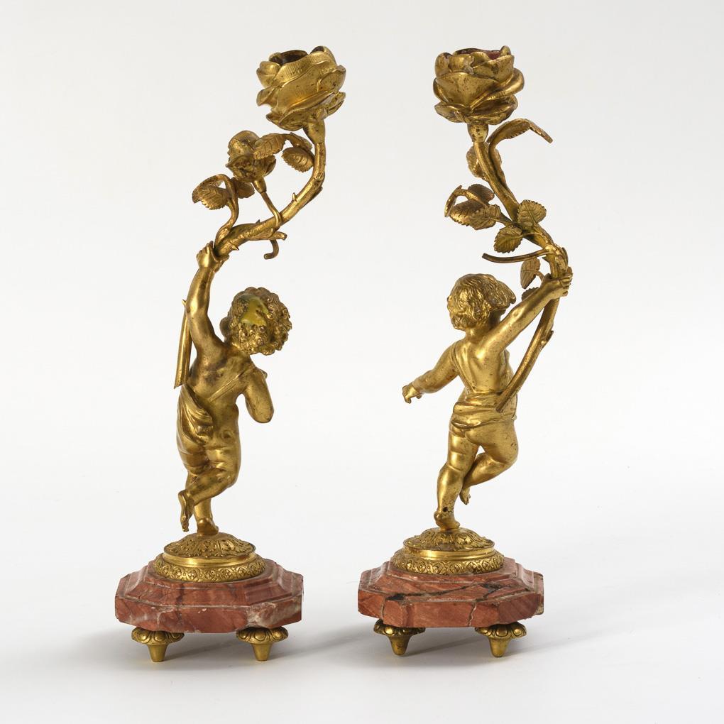 2 Kerzenleuchter mit Marmor-Sockeln und tänzerisch laufenden Amoretten, die je einen Rosenzweig emporhalten, wobei die Blüte als Tülle dient. Beide Marmor-Sockel geklebt, 1 Bronzefuß angebrochen, je wohl verbogen, je 1 Fehlteil am Zweig.
