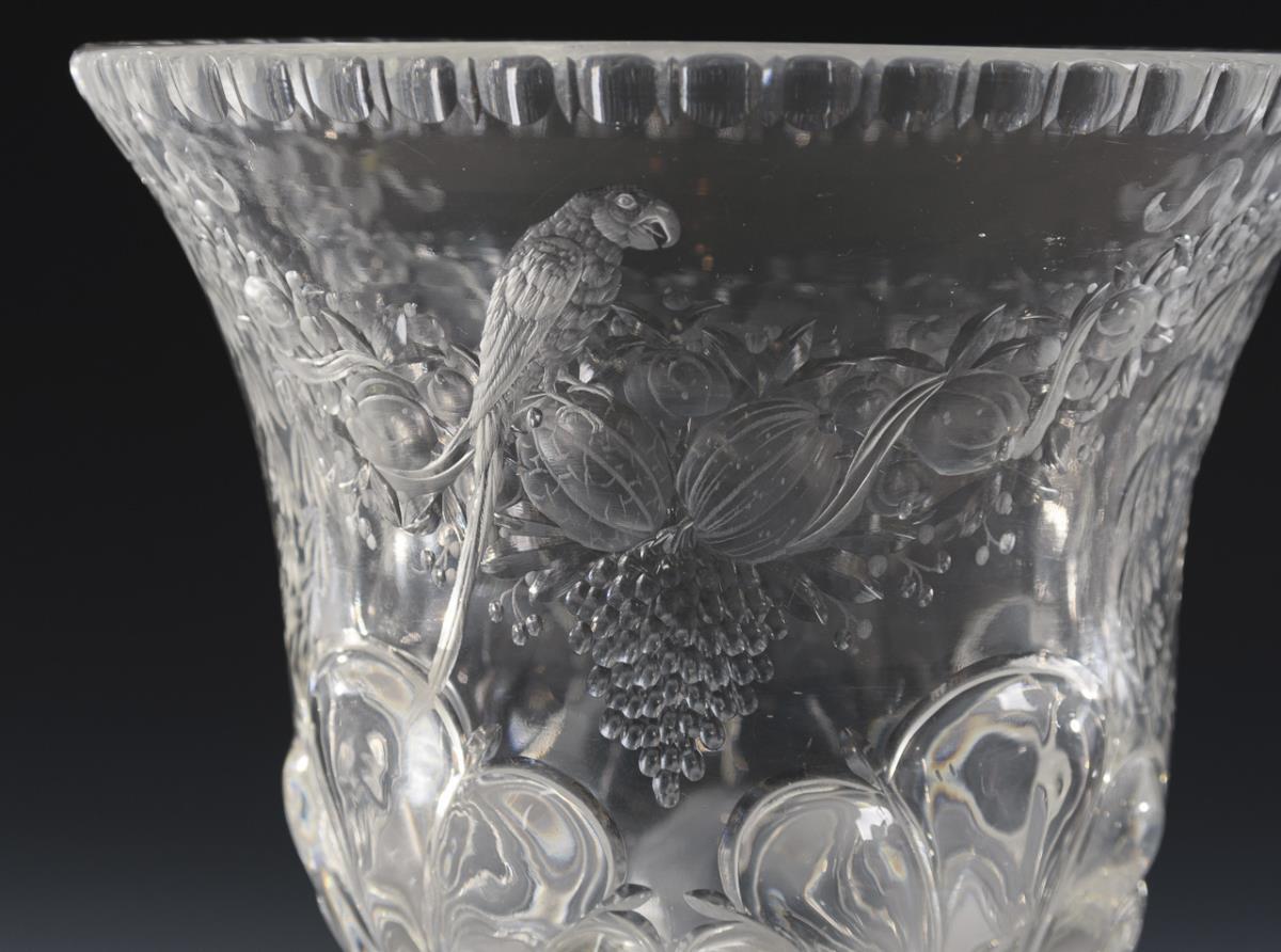 Kraterschale, oktogonaler Fuß. Aufwändig graviert und poliert mit der Darstellung von Lorbeerkränzen, Weintrauben sowie einem Papagei auf einer Fruchtgirlande, am Kuppaansatz hochgeschliffene Blattfächer. 1 Bestoßung an 1 Fußkante, 3 minimale Bestoßungen am Mündungsrand.