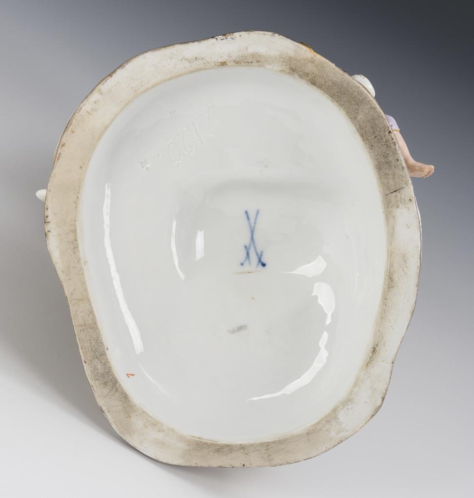 Gruppe von fünf Putten mit Weinbütte, Lyra, Weinschale und Weinbecher an einem Weinfass. Einige Blätter bestoßen, 1 Fuß restauriert, 1 Band der Bütte bestoßen, Deckel fehlt.