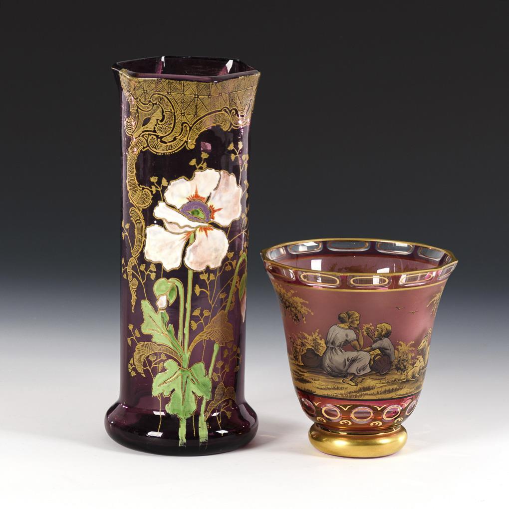 1x Legras, unsigniert, um 1900: Zylindervase aus violettem Glas mit sechspassigem Rand und ausgestelltem Stand; schauseitig eine emailgemalte Mohnblume unter goldfarbenen Rocaillen (H 27 cm). / 1x Steinschönau, um 1960, signiert "W. Herrmann" (= Walter Herrmann): Kratervase aus farblosem, purpurfarben überfangenem Glas mit Linsenschliff; umlaufend die gold- und schwarzlotgemalte Darstellung einer Landschaft mit Mutter, Kind und Ziegen (H 14 cm).