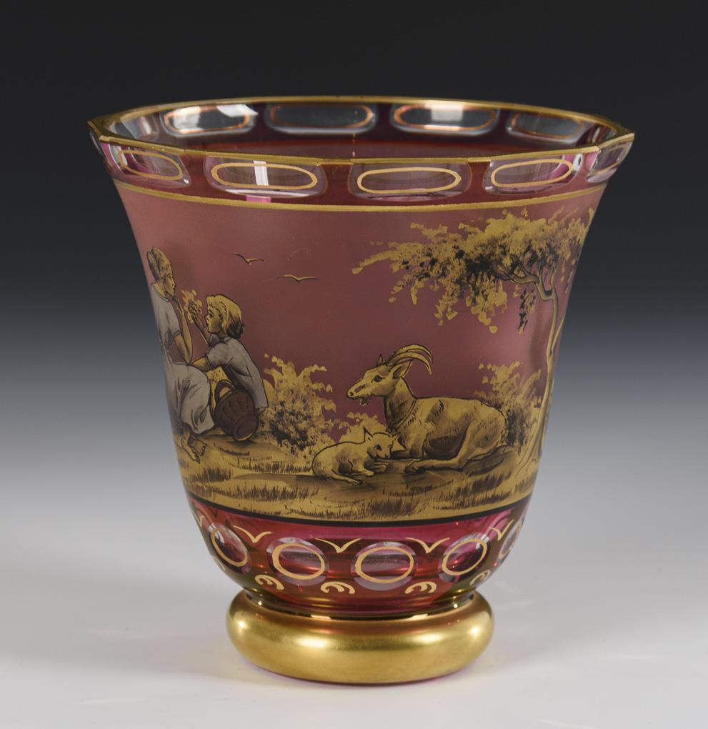 1x Legras, unsigniert, um 1900: Zylindervase aus violettem Glas mit sechspassigem Rand und ausgestelltem Stand; schauseitig eine emailgemalte Mohnblume unter goldfarbenen Rocaillen (H 27 cm). / 1x Steinschönau, um 1960, signiert "W. Herrmann" (= Walter Herrmann): Kratervase aus farblosem, purpurfarben überfangenem Glas mit Linsenschliff; umlaufend die gold- und schwarzlotgemalte Darstellung einer Landschaft mit Mutter, Kind und Ziegen (H 14 cm).