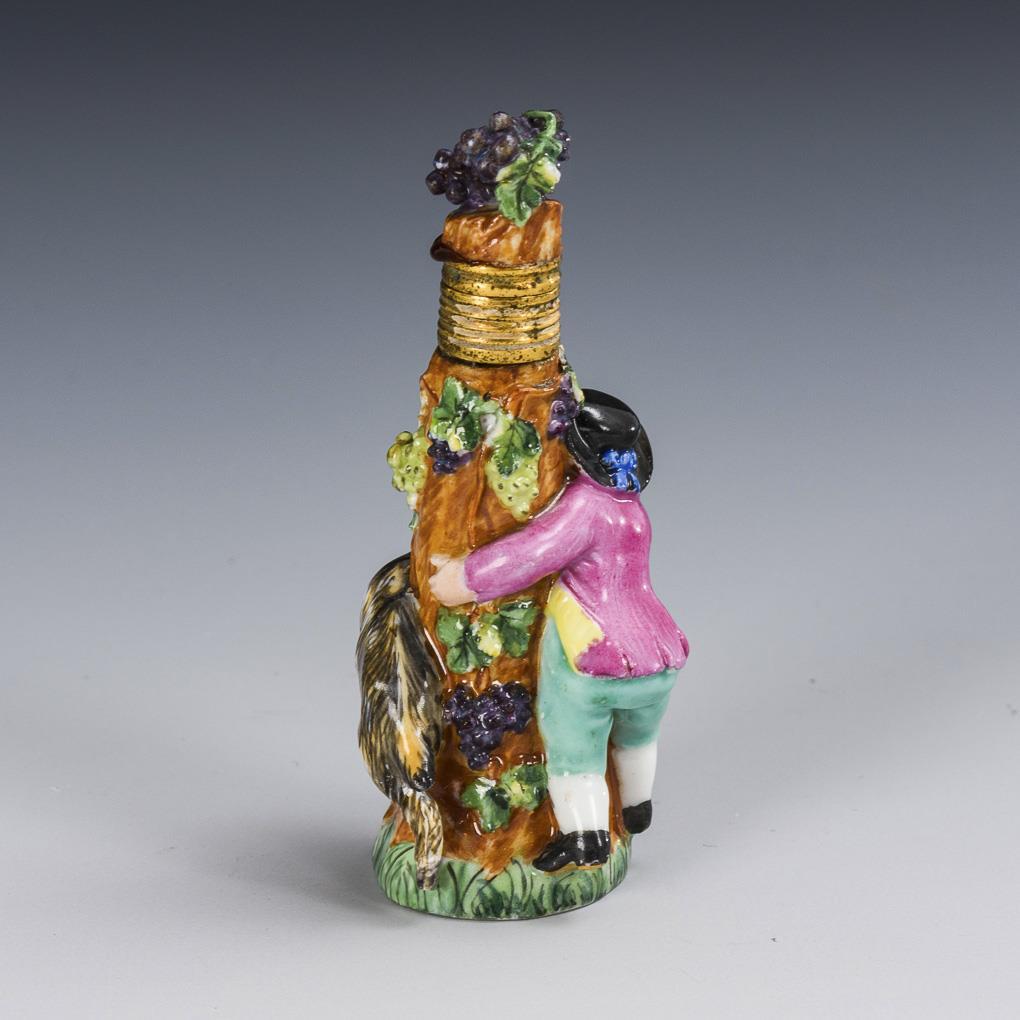 An einem Baumstamm als Flakon stehender Knabe, den Ziegenbock bei den Hörnern packend, Stopfen mit plastischen Weintrauben. Stand, Ziegenschwanz, -hinterbein und -hörner und Hutrand restauriert.