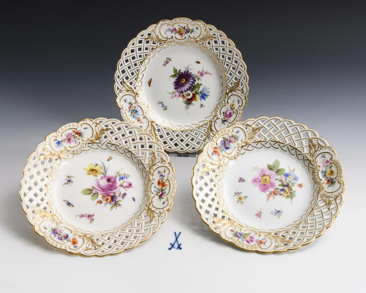 3 Durchbruchteller mit Blumenmalerei. Meissen.