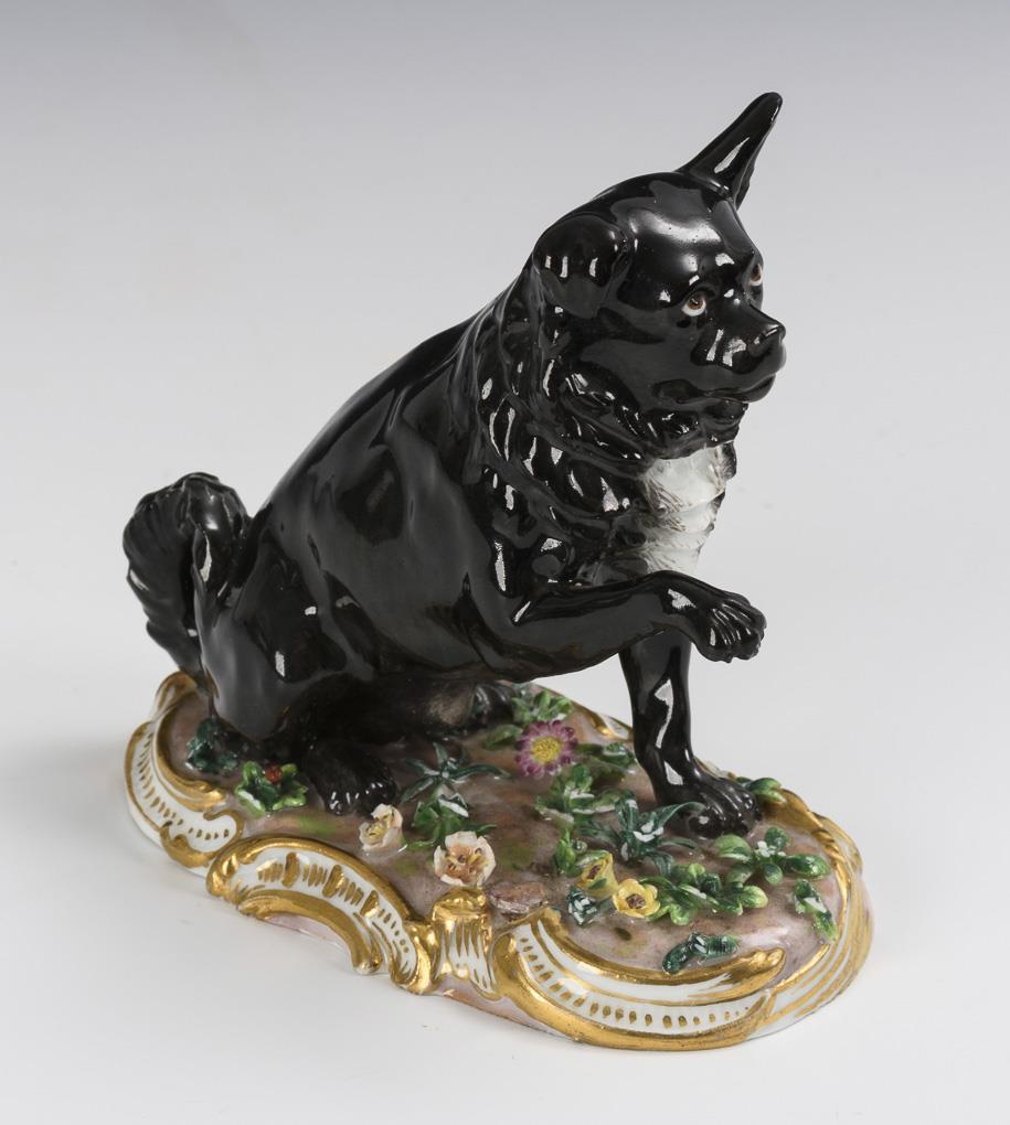 Auf einem blütenbelegten Rocaillesockel sitzender, die rechte Pfote hebender Spitz. Bestoßungen am Belag, 2 Bestoßungen am Sockelrand.