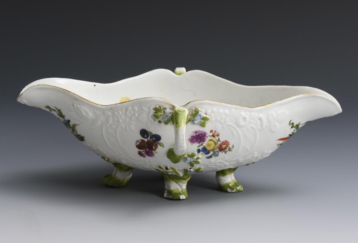 Reliefdekor "Marseille". Rautenförmige Sauciere mit zwei Asthenkeln und vier Astfüßen. 2 Füße bestoßen, Goldrand etwas berieben.