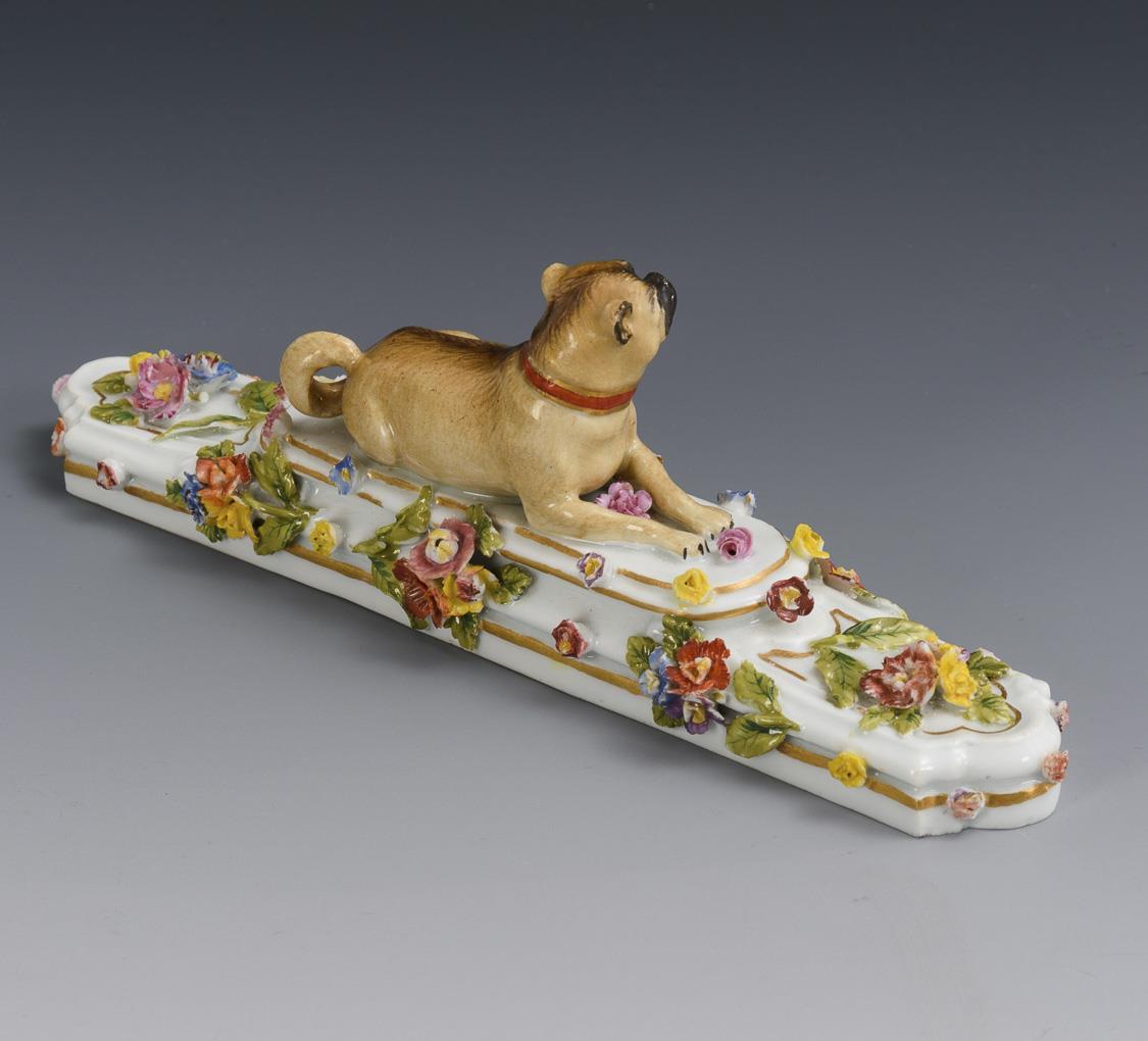 Länglicher, reich blütenbelegter Sockel mit der Plastik eines liegenden Mopses. Bestoßungen am Belag, Chip am Sockel, 1 Ohr restauriert.