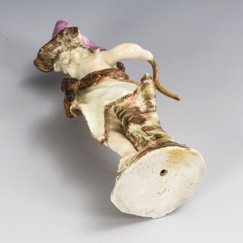 An einem Baumstumpf stehender Putto mit Ziegenfell, in den Händen eine Wünschelrute haltend. Ziegenkopf, Wünschelrute, Hals und Hutkrempe restauriert.
