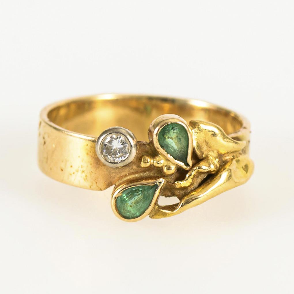 2 zargengefasste Smaragde und Brillant zwischen breiter Schiene.