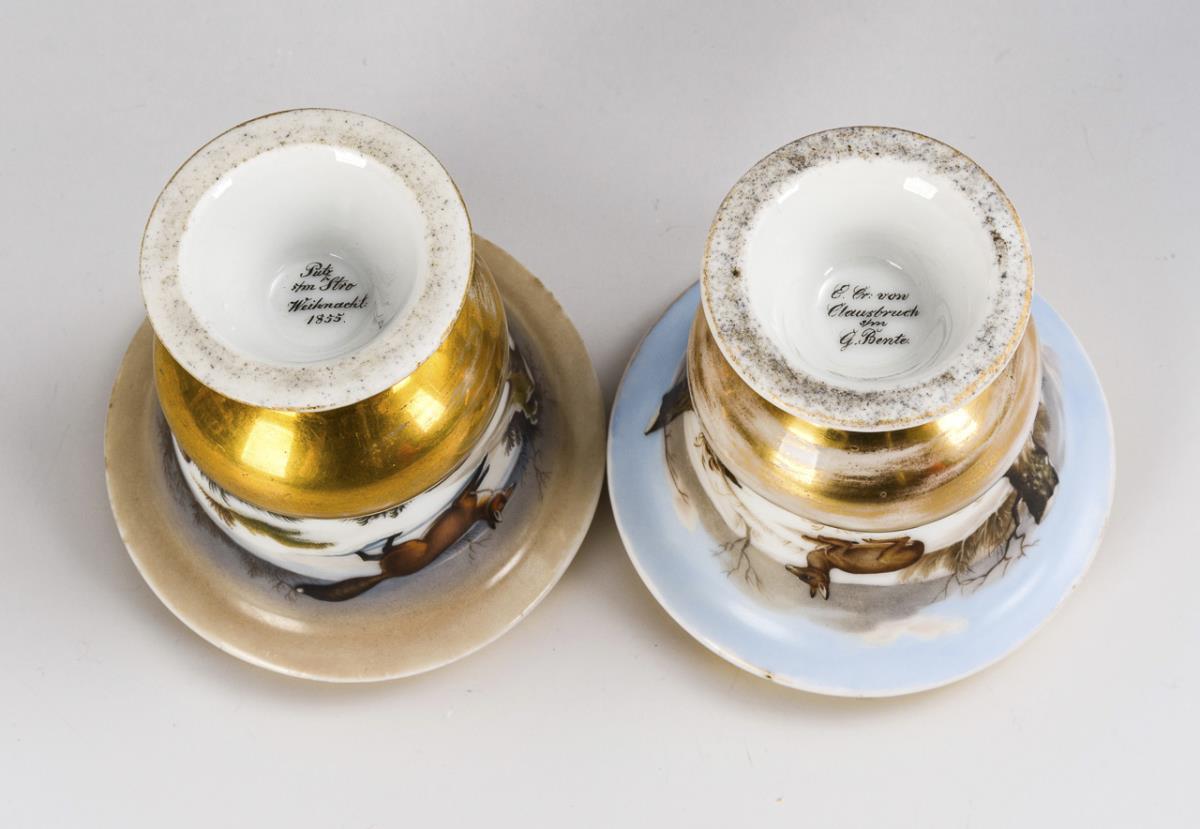 Gefußte Glockenbecher mit Mittelsteg. Umlaufend die Darstellung einer Winterlandschaft mit Fuchs und Wachteln bzw. mit Hirsch und Hirschkuh. 1x unterseitig die Widmung "Putz s/m Stro Weihnacht 1855" und 1x die Widmung "E. Cr. von Clausbruch s/m G. Bente". Gold berieben.