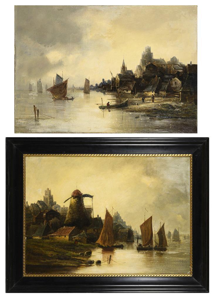 Fischerboote vor der Küstenstadt unter leicht wolkigem Himmel sowie mehrere Schiffe nahe den Häusern am Ufer unter grau bedecktem Himmel. Je restauriert, Leinwand doubliert.