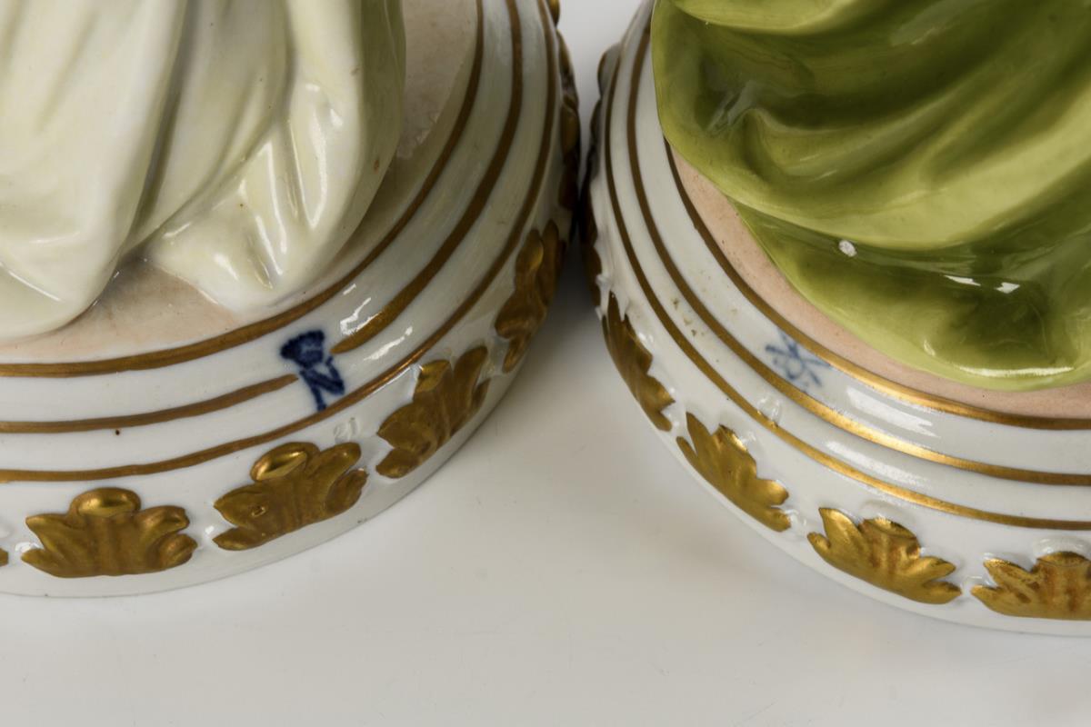 1x Figur eines sich auf einen Hocker knienden Rokokokavaliers mit Stab. / 1x Rokokodame mit Amorknaben zu ihren Füßen. Stab des Herren fehlt.