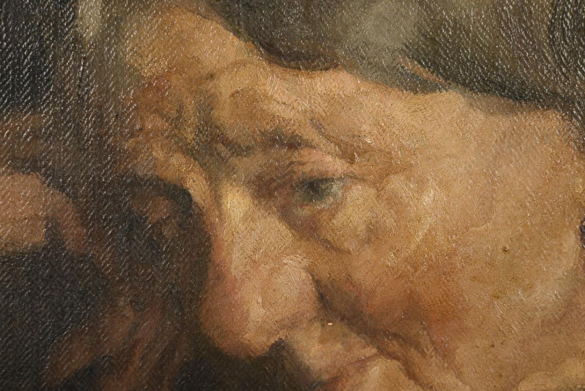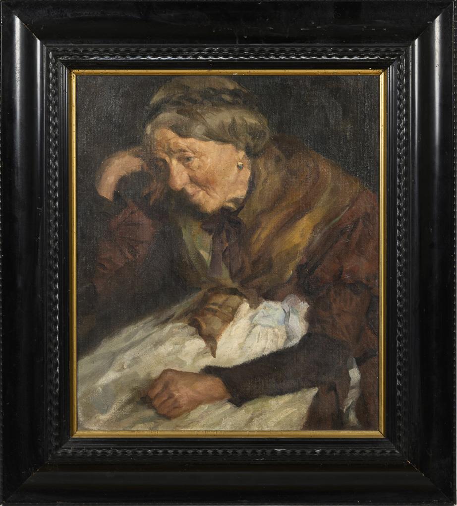 Porträt der alten Frau in gebeugter Haltung vor dunklem Hintergrund.