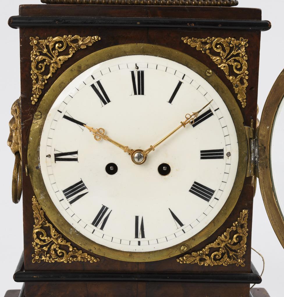 Gerade Stelenform mit Urnenbekrönung, seitlichen Löwenmaskaronen mit Ringhandhaben, floralen Zierbeschlägen und 4 hohen Tatzenfüßen auf Sockel mit gedrückten Kugelfüßen. Seitlicher Seilzug für Stundenrepetition. Alters- und Gebrauchsspuren, teils leichte Defekte, Lötspuren, Ergänzungen.