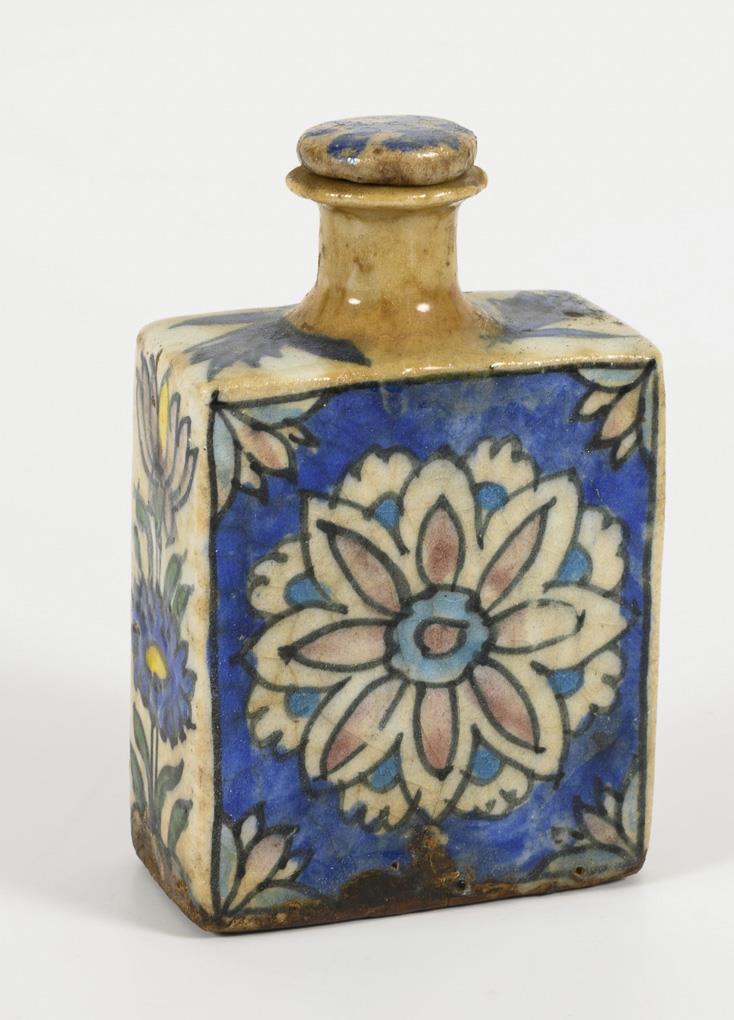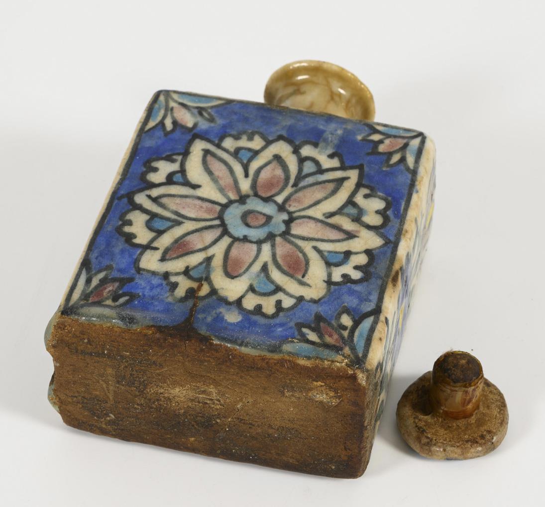 Farbig glasiert, mit Blütenmotiven und Stöpsel. Glasur krakeliert und am unteren Rand unregelmäßig. Altersspuren.