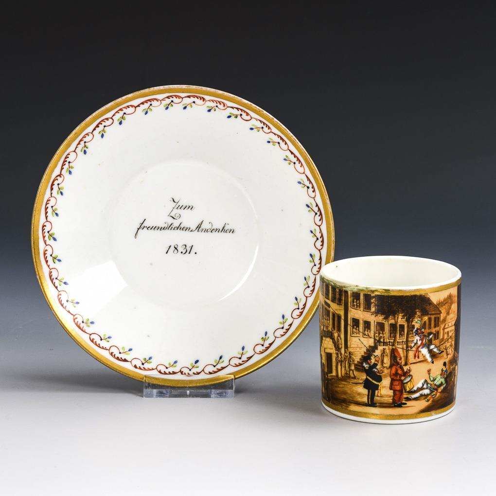 Zylindertasse mit Ohrenhenkel. Schauseitig die Darstellung einer Gauklerszene mit Seiltänzer, im Spiegel der Untertasse die Bezeichnung "Zum Andenken 1831." . Tassenrand restauriert.