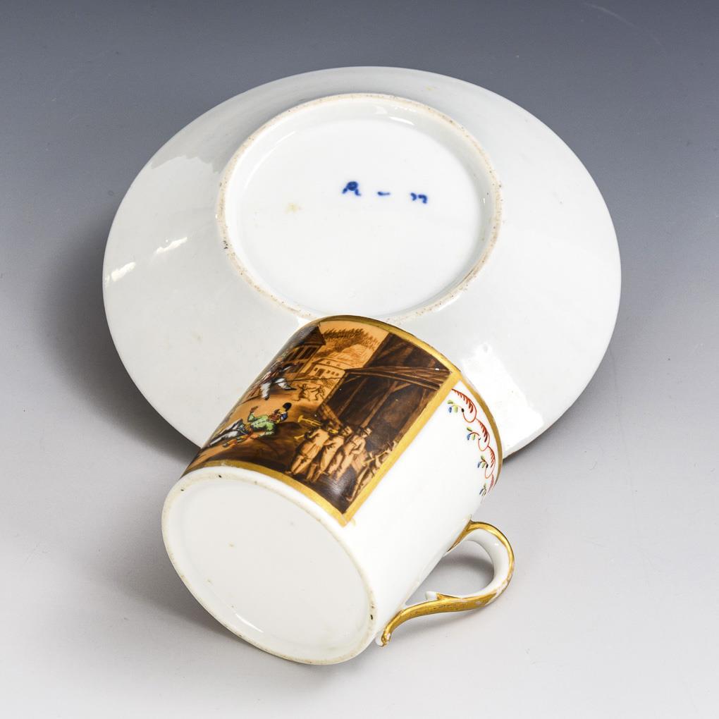 Polychrom bemalt, goldstaffiert. Tasse (H 6 cm), originale Untertasse (Ø 13,5 cm).