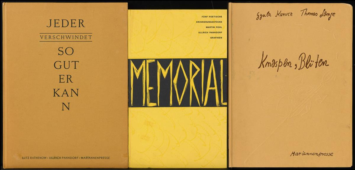 3 vollständige, gebundene Künstlerbücher: "5 poetische Erinnerungsstücke", herausgegeben von Martin Pohl und Ulrich Panndorf, Exemplar: 23/200 (+ 30 römisch nummerierte Künstlerexemplare), Impressum mit Bleistiftsignatur beider Künstler, 1986 (= 34. Veröffentlichung der Mariannenpresse), 1986 | "Knospen, Blüten" mit einem Text von Gyula Kurucz und 5 handsignierten Original-Radierungen von Thomas Lange, Exemplar: 10/100 (davon 20 Vorzugsexemplare sowie 30 römisch nummerierte Künstlerexemplare), Impressum mit Bleistiftsignatur beider Künstler, 1990 (= 52. Veröffentlichung der Mariannenpresse) | "Jeder verschwindet so gut er kann", mit Texten von Lutz Rathenow und 5 Radierungen von Ulrich Panndorf, Exemplar: 43/100 (+ 30 römisch nummerierte Künstlerexemplare), Impressum mit Bleistiftsignatur beider Künstler, 1984 (= 21. Veröffentlichung der Mariannenpresse).