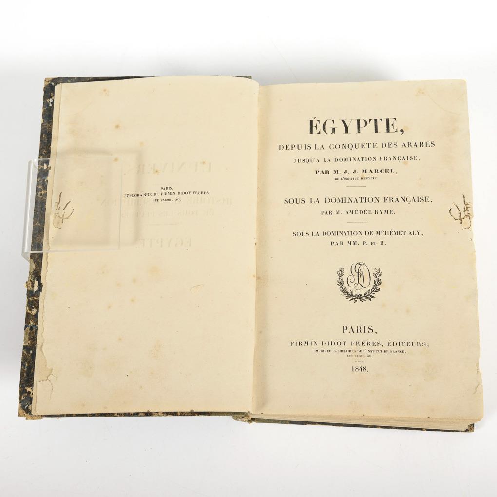 In Französisch geschriebene Geschichte und Beschreibung aller Völker; hier Ägypten (3 Bände in einem Buch) ab der Eroberung durch die Araber bis zur Moderne. Zahlreiche Abbildungen. Brauner Pappeinband mit hellblauem Leinenrücken. Vorsatz leicht eingerissen, leicht gebräunt, einige Fraßspuren, zumindest 1 Abbildung ausgeschnitten, Einband mit Alters-/Gebrauchsspuren.