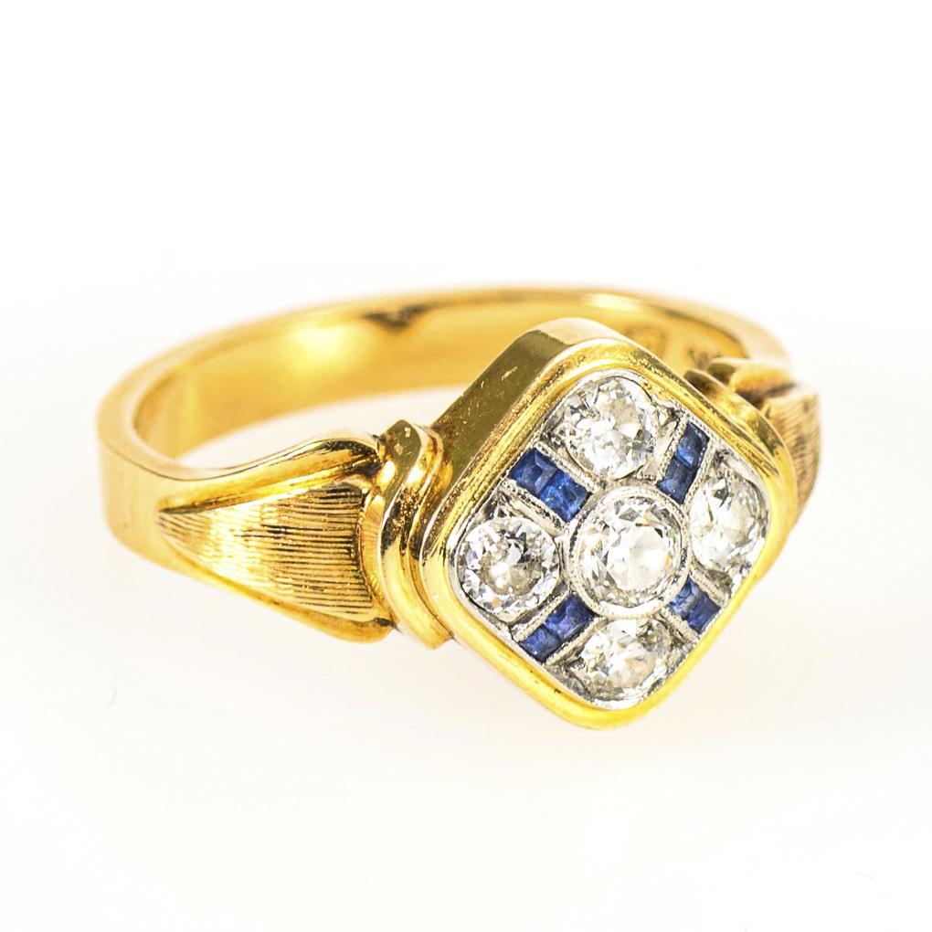 5 eingelassene Brillanten und 6 kleine Saphire zwischen mittlerer Schiene.